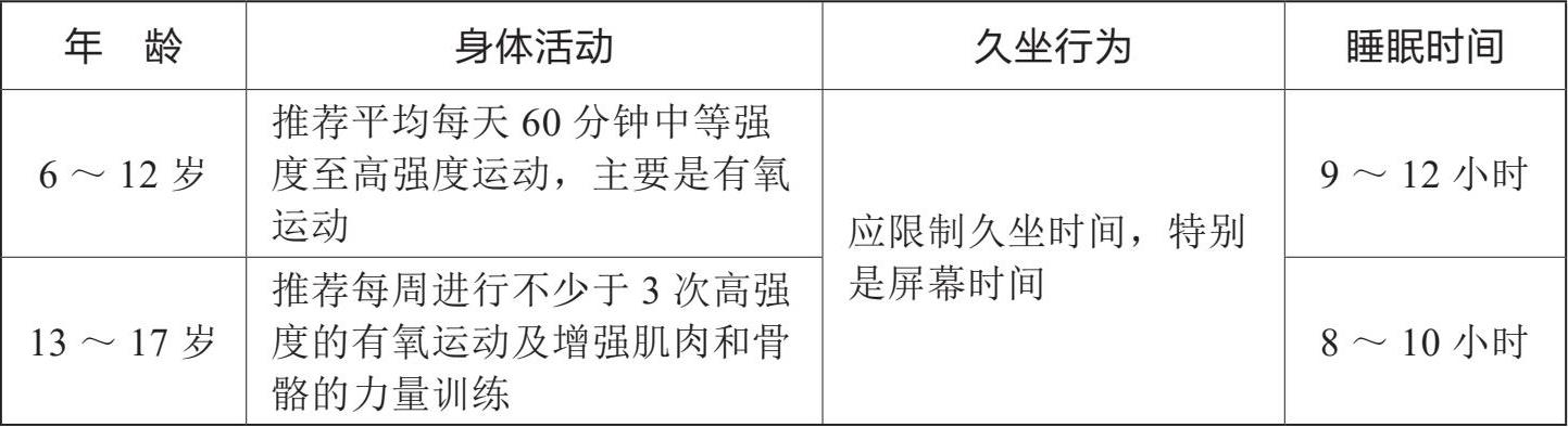 孩子们远离屏幕,享受健康、活力十足的生活,是教育儿童青少年养成健康生活方式的目标。首先,健康的饮食是非常重要的。健康的饮食不仅是吃得好,还包括理解食物对身体的影响。如果孩子们能够了解健康饮食和能量代谢的知识,他们就会选择营养均衡的食物。人们可以通过课堂教育、互动游戏和家庭烹饪活动等方式,让孩子们学习和体验健康饮食的乐趣。其次,睡眠也至关重要。一个良好的睡眠习惯可以使孩子们精力充沛,从而减少对屏幕的依赖。再次,减少久坐行为也很重要。多数儿童青少年在家中久坐,通常是因为看电视或玩电子设备。通过提供更多的体育活动机会,人们可以鼓励孩子们积极运动,从而自然而然地减少屏幕时间。家长在这个过程中扮演着重要角色。他们不仅需要监督孩子的屏幕时间,还应该通过表扬和鼓励强化孩子的健康行为。如果家长能够一起参与体育活动,或者在家中创造一个无屏幕的环境,孩子们就更可能远离屏幕。最后,学校也是关键的一环。教师可以将健康生活方式的培养纳入课程,教育学生成为健康生活的践行者和传播者。学校可以提供各种体育和课外活动,让学生有机会参与,这不仅有助于减少屏幕时间,还能帮助孩子们建立团队合作和社交技能。表2-1 是 2020 年世界卫生组织《关于身体活动和久坐行为指南》推荐的儿童青少年健康生活行为要求。