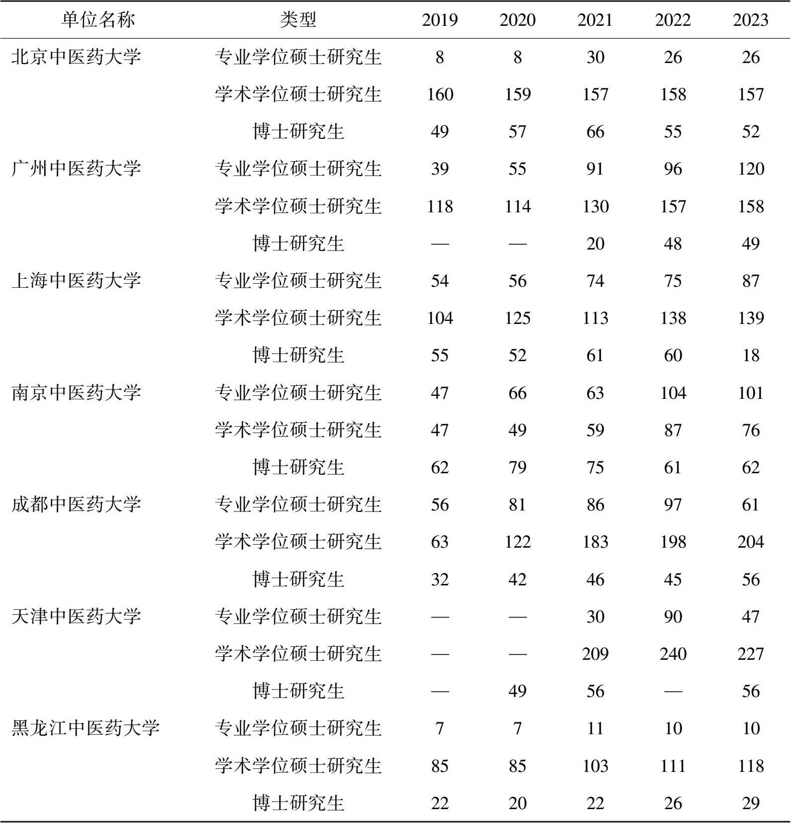 表2-1 2019—2023年我国7所高校中药学研究生招生情况