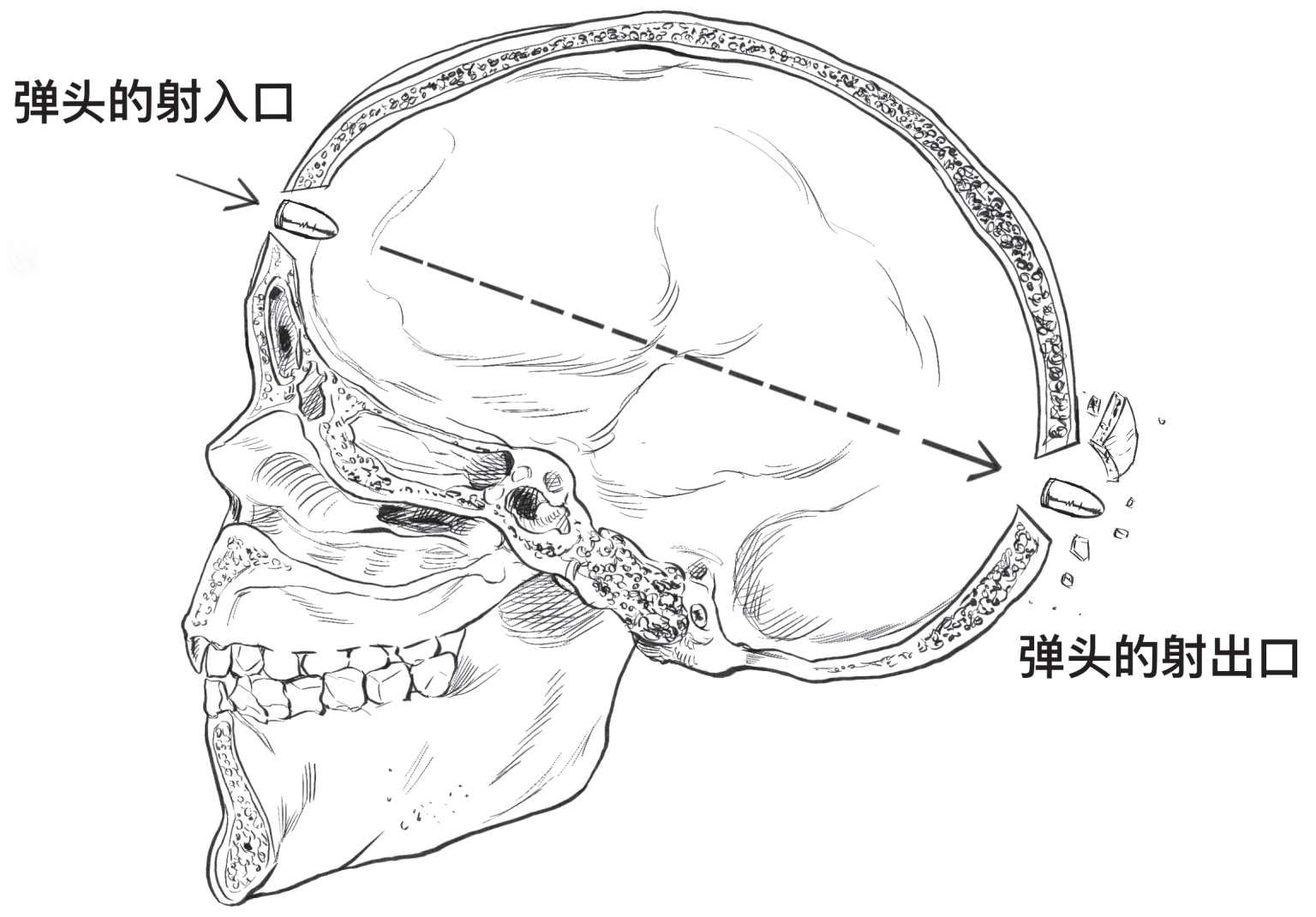 人的颅骨呈扁平状,不妨将其想象成一张硬纸壳。子弹射入时,会留下一个“喇叭口”似的圆圆的小洞,这便是“射入口”;子弹射出时,会形成另一个“喇叭口”形状的小洞,这便是“射出口”。射入口和射出口的喇叭口朝向是正好相反的(射入口的喇叭口朝颅内,射出口的喇叭口朝颅外)。法医正是根据这个特征,判断导致颅脑损伤的凶器是枪弹,而不是刺器。再通过精准测量射入口的直径,就可以知道射入颅内的子弹是由多少口径的枪支发射的。