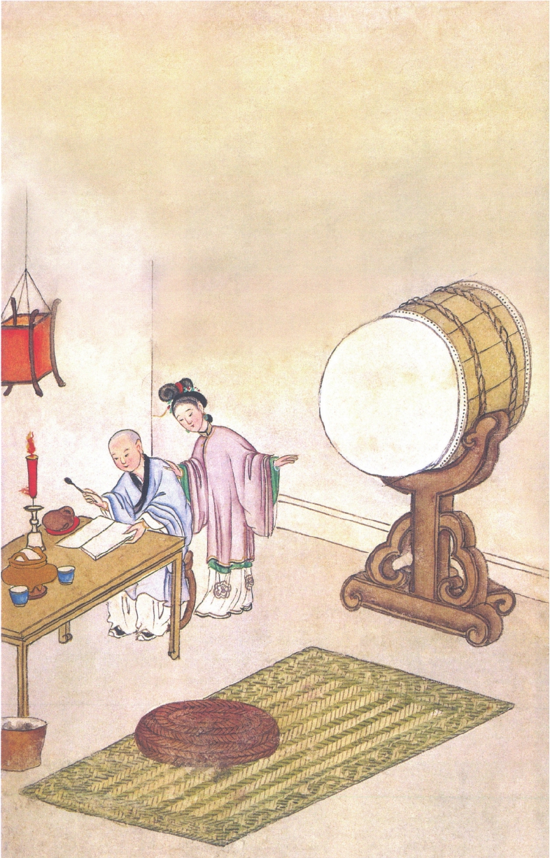 却说小姐自见儿子之后,心内一忧一喜。忽一日推病,茶饭不吃,卧于床上。刘洪归衙,问其原故,小姐道:“我幼时曾许下一愿,许舍僧鞋一百双。昨五日之前,梦见个和尚,手执利刃,要索僧鞋,便觉身子不快。”刘洪道:“这些小事,何不早说?”随升堂分付王左衙、李右衙:江州城内百姓,每家要办僧鞋一双,暑袜一双,限五日内完纳。百姓俱依限完纳讫。小姐对刘洪道:“既僧鞋做完,这里有甚么寺院,好去还愿?”刘洪道:“这江州有个金山寺、焦山寺,听你在那个寺里去。”小姐道:“久闻金山寺好个寺院,我就往金山寺去。”刘洪即唤王、李二衙办下船只。小姐带一个心腹人,同上了船。稍水将船撑开,就投金山寺去。