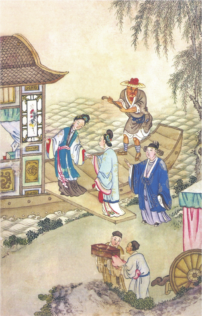途路艰苦,甚不可言。晓行夜宿,不觉已到洪江渡口。只见稍水刘洪、李彪二人撑船到岸迎接。也是光蕊前生合当有此灾难,正撞遇这冤家。光蕊令家僮将行李搬上船去,夫妇齐齐上船。刘洪睁眼看时,只见那殷小姐面如满月,眼似秋波,樱桃小口,绿柳蛮腰,真个有沉鱼落雁之容,闭月羞花之貌。刘洪陡起狼心,遂与李彪设计,将船撑至没人烟处,候至夜静三更,先将家僮杀死,次将光蕊打死,把尸首都推在水里去了。小姐见他打死了丈夫,也便将身赴水。刘洪一把抱住道:“你若从我,万事皆休;若不从时,一刀两断!”那小姐没奈何,只得权时应承,顺了刘洪。那贼把船渡到南岸,将船付与李彪自管,他就穿了光蕊衣冠,带了官凭,同小姐往江州上任去了。