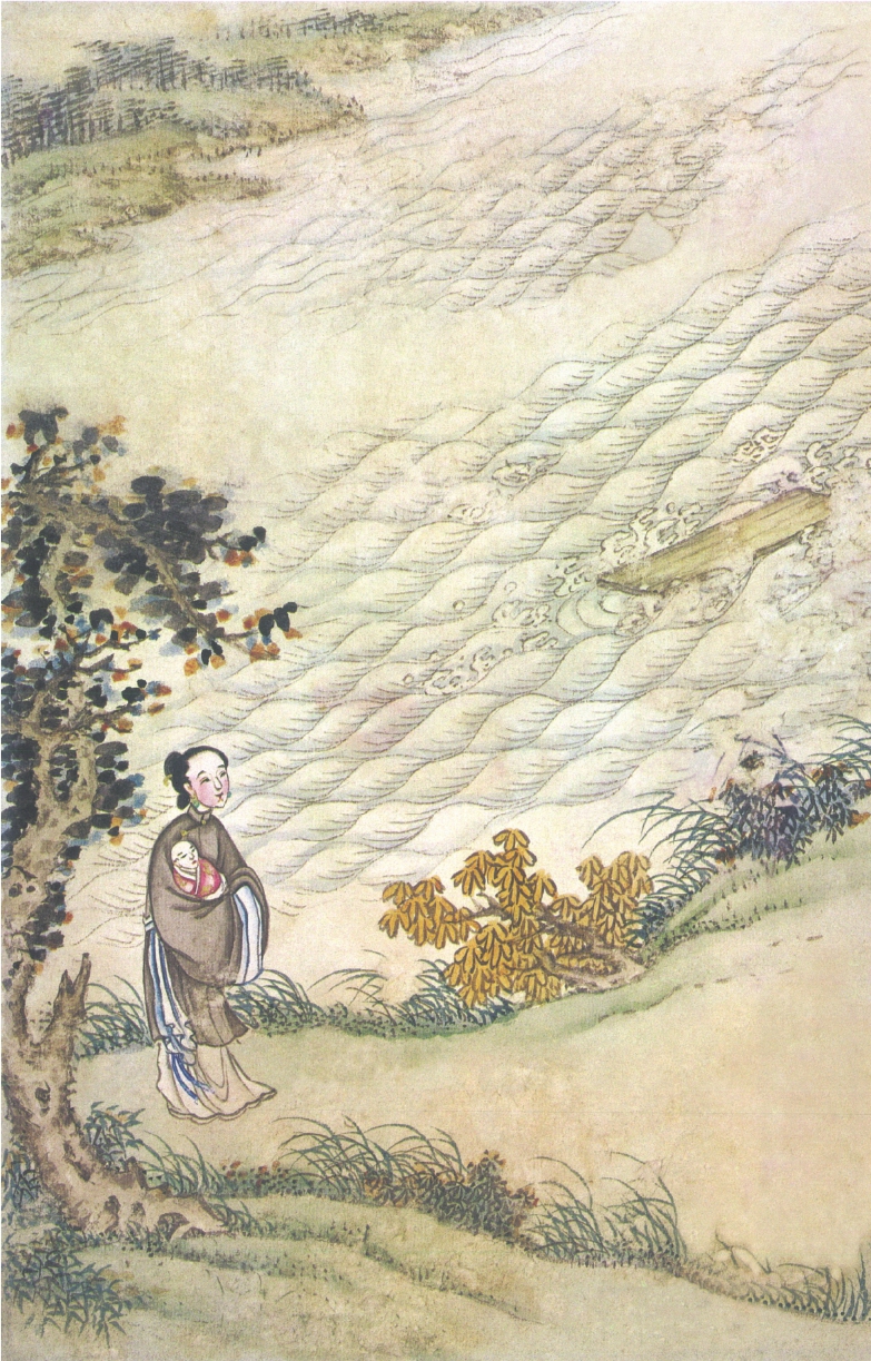 光阴迅速。一日,刘洪公事远出。小姐在衙思念亲夫,正在花亭上感叹,忽然身体困倦,腹内疼痛,晕闷在地,不觉生下一子,耳边听得有人嘱曰:“满堂娇,听吾叮嘱:吾乃南极星君,奉观世音菩萨法旨,特送此子与你。异日声名远大,非比等闲。刘贼若回,必害此子,汝可用心保护。汝夫已得龙王相救,日后夫妻相会,子母团圆,雪冤报仇,定有日也。谨记吾言。快醒!快醒!”言讫而去。小姐醒来,句句记得,将子抱定,无计可施。忽然刘洪回来,一见此子,便要淹杀。小姐再三哀求:“今日天色已晚,容待明日抛去江中。”