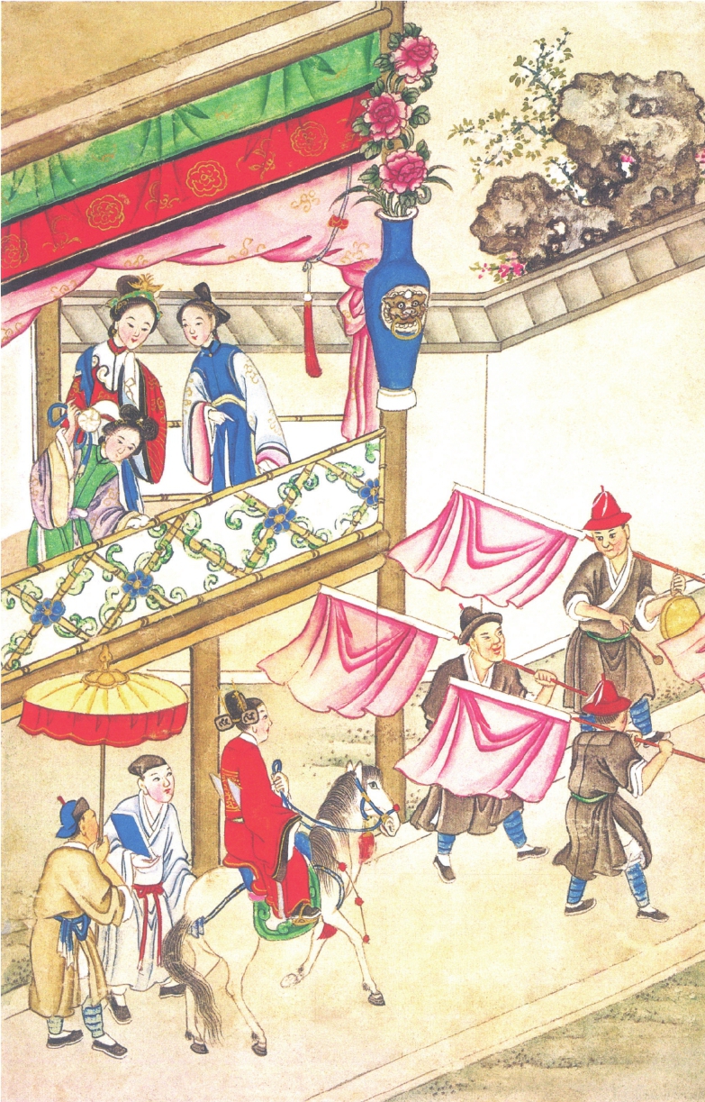 不则一日,已到长安。正值大开选场,光蕊就同众举子进场应考。考毕,中选。及廷试三策,唐王御笔亲赐状元,跨马游街三日。不期游到丞相殷开山门首,有丞相所生一女,名唤温娇,又名满堂娇,未曾匹配与人,正高结彩楼,抛打绣球卜婿。正值陈光蕊在楼下经过,小姐一见光蕊人材出众,况是新科状元,心内十分欢喜,就在彩楼上将绣球抛下,正打着光蕊的乌纱帽。只听得一派笙箫细乐,十数个婢妾走下楼来,把光蕊马头挽住,迎状元入了相府。即请丞相和夫人出堂,唤宾人赞礼,小姐就与光蕊拜了天地,夫妻交拜毕,又拜了岳丈、岳母。丞相分付安排酒席,欢饮一宵。二人同携素手,共入兰房。
