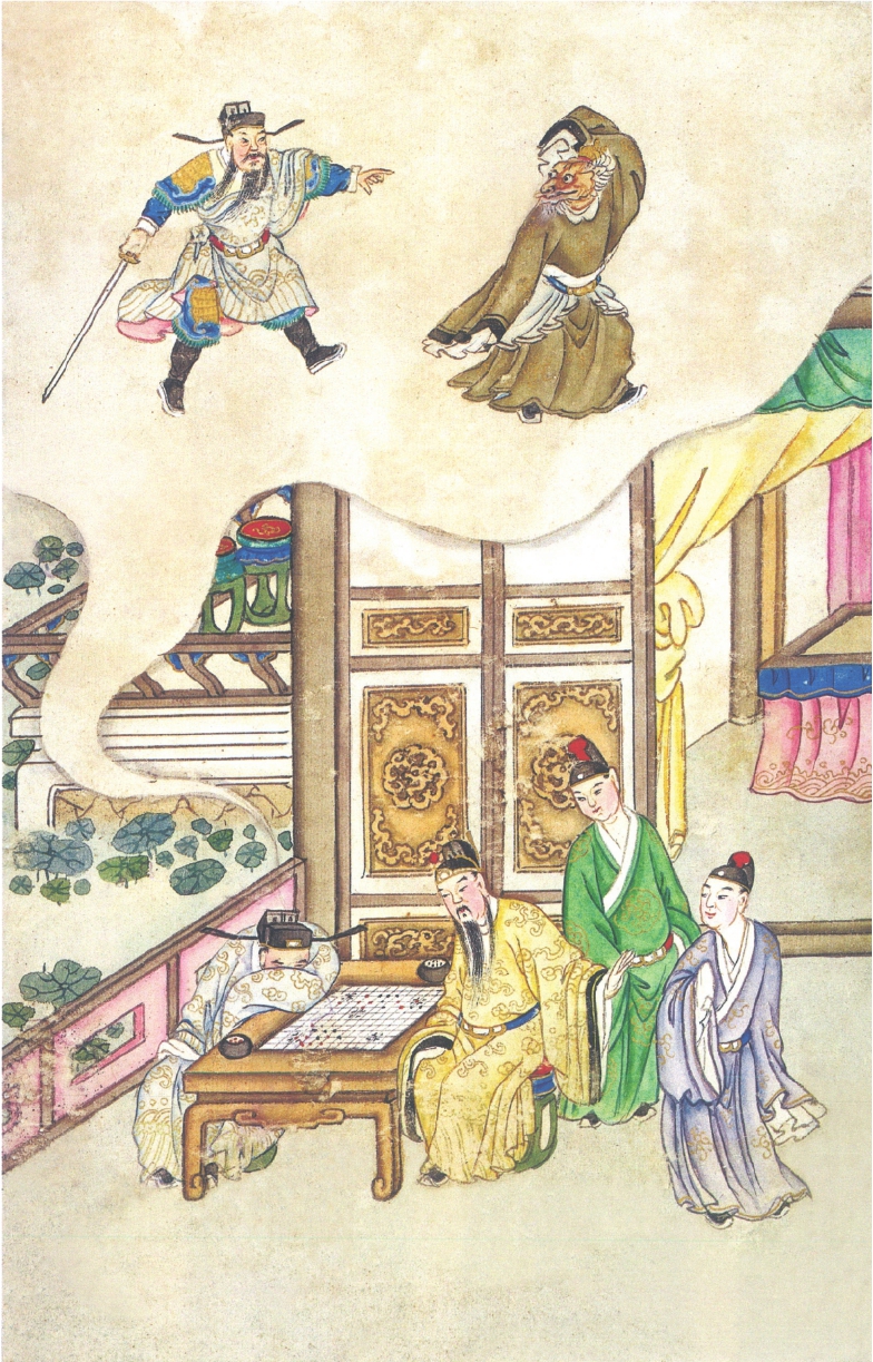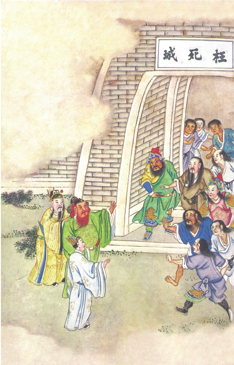 二人正说间,只见那边有一对青衣童子,执幢幡宝盖,高叫道:“阎王有请,有请。”太宗遂与崔判官并二童子举步前进。忽见一座城,城门上挂着一面大牌,上写着“幽冥地府鬼门关”七个大金字。那青衣将幢幡摇动,引太宗径入城中,顺街而走。只见那街旁边有先主李渊、先兄建成、故弟元吉,上前道:“世民来了!世民来了!”此等点缀,妙不可言。那建成、元吉就来揪打索命。太宗躲闪不及,被他扯住。幸有崔判官唤一个青面獠牙鬼使,喝退了建成、元吉,太宗方得脱身而去。行不数里,见一座碧瓦楼台,真个壮丽。但见: