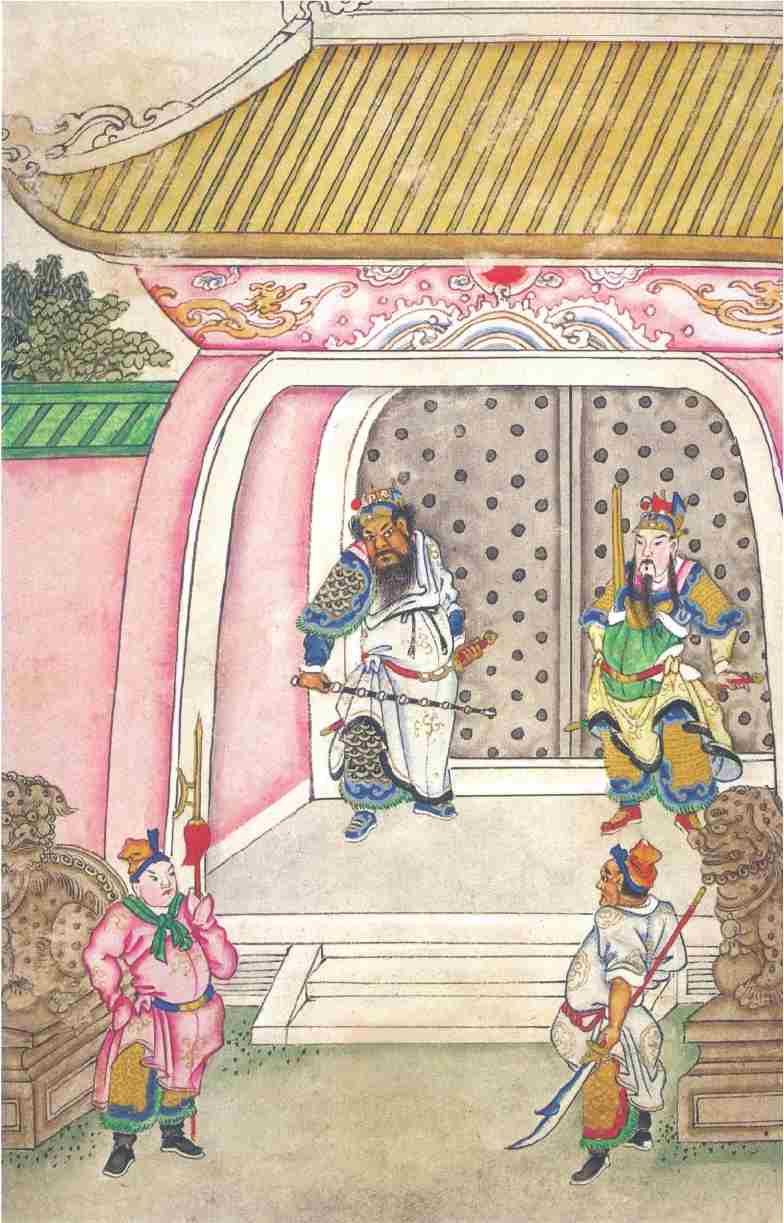 二将军侍立门旁,一夜天晚,更不曾见一点邪祟。是夜,太宗在宫,安寝无事;晓来宣二将军,重重赏劳道:“朕自得疾,数日不能得睡,今夜仗二将军威势甚安。卿且请出安息安息,待晚间再一护卫。”二将谢恩而出。遂此二三夜把守,俱安。只是御膳减损,病转觉重。太宗又不忍二将辛苦,又宣叔宝、敬德与房、杜诸公入宫,分付道:“这两日朕虽得安,却只难为秦、胡二将军彻夜辛苦。朕欲召巧手丹青,传二将军真容,贴于门上,免得劳他,如何?”众臣即依旨,选两个会写真的,着胡、秦二公依前披挂,照样画了,贴在门上。夜间也即无事。
