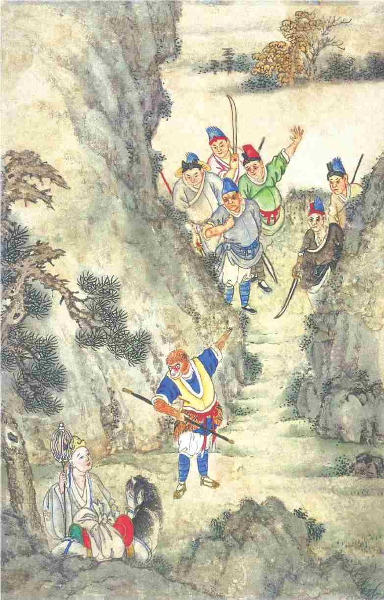 师徒们正走多时,忽见路旁唿哨一声,闯出六个人来,各执长枪短剑,利刃强弓,大咤一声道:“那和尚!那里走!赶早留下马匹,放下行李,饶你性命过去!”唬得那三藏魂飞魄散,跌下马来,不能言语。行者用手扶起道:“师父放心,没些儿事。这都是送衣服送盘缠与我们的。”三藏道:“悟空,你想有些耳闭?他说教我们留马匹、行李,你倒问他要甚么衣服、盘缠?”行者道:“你管守着衣服、行李、马匹,待老孙与他争持一场,看是何如。”三藏道:“好手不跌双拳,双拳不如四手。他那里六条大汉,你这般小小的一个人儿,怎么敢与他争持?”