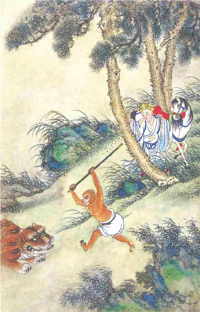 却说那孙行者请三藏上马,他在前边背着行李,赤条条,拐步而行。不多时,过了两界山,忽然见一只猛虎,咆哮剪尾而来。三藏在马上惊心。行者在路旁欢喜道:“师父莫怕他。他是送衣服与我的。”放下行李,耳朵里拔出一个针儿,迎着风幌一幌,原来是个碗来粗细一条铁棒。他拿在手中,笑道:“这宝贝,五百馀年不曾用着他,今日拿出来挣件衣服儿穿穿。”你看他拽开步,迎着猛虎,道声:“业畜!那里去!”那只虎蹲着身,伏在尘埃,动也不敢动动。却被他照头一棒,就打的脑浆迸万点桃红,牙齿喷几珠玉块,唬得那陈玄奘滚鞍落马,咬指道声:“天那!天那!刘太保前日打的斑斓虎,还与他斗了半日;今日孙悟空不用争持,把这虎一棒打得稀烂,正是‘强中更有强中手’!”