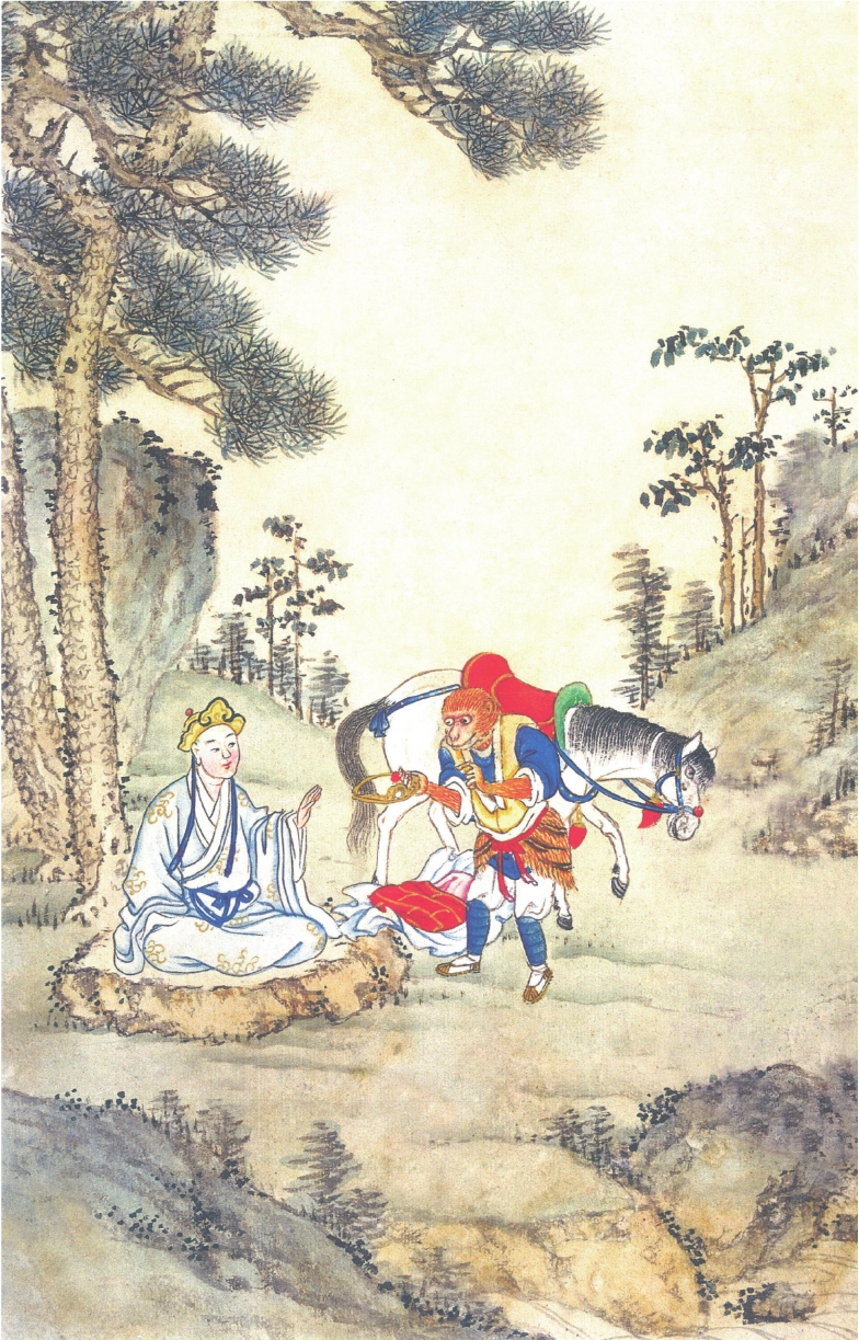 却说那悟空别了师父,一筋斗云径转东洋大海。按住云头,分开水道,径至水晶宫前。早惊动龙王出来迎接。接至宫里坐下,礼毕,龙王道:“近闻得大圣难满,失贺!想必是重整仙山,复归古洞矣。”悟空道:“我也有此心性,只是又做了和尚了。”龙王道:“做甚和尚?”行者道:“我亏了南海菩萨劝善,教我正果,随东土唐僧,上西方拜佛,皈依沙门,又唤为‘行者’了。”龙王道:“这等真是可贺!可贺!这才叫做改邪归正,惩创善心。既如此,怎么不西去,复东回何也?”行者笑道:“那是唐僧不识人性。有几个毛贼剪径,是我将他打死,唐僧就绪绪叨叨,说了我若干的不是。你想老孙可是受得闷气的?是我撇了他,欲回本山,故此先来望你一望,求钟茶吃。”