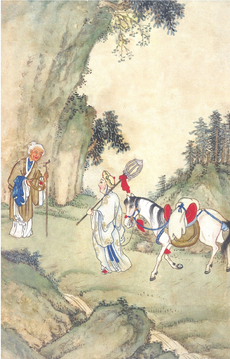 那长老只得收拾行李,捎在马上,也不骑马,一只手拄着锡杖,一只手揪着缰绳,凄凄凉凉,往西前进。行不多时,只见山路前面,有一个年高的老母,捧一件绵衣,绵衣上有一顶花帽。三藏见他来得至近,慌忙牵马,立于右侧让行。那老母问道:“你是那里来的长老,孤孤恓恓独行于此?”三藏道:“弟子乃东土大唐奉圣旨往西天拜活佛求真经者。”老母道:“西方佛乃大雷音寺天竺国界,此去有十万八千里路。你这等单人独马,又无个伴侣,又无个徒弟,你如何去得!”三藏道:“弟子日前收得一个徒弟,他性泼凶顽,是我说了他几句,他不受教,遂渺然而去也。”老母道:“我有这一领绵布直裰,一顶嵌金花帽。原是我儿子用的。他只做了三日和尚,不幸命短身亡。我才去他寺里,哭了一场,辞了他师父,将这两件衣帽拿来,做个忆念。长老呵,你既有徒弟,我把这衣帽送了你罢。”三藏道:“承老母盛赐;但只是我徒弟已走了,不敢领受。”老母道:“他那厢去了?”三藏道:“我听得呼的一声,他回东去了。”老母道:“东边不远,就是我家,想必往我家去了。我那里还有一篇咒儿,唤做‘定心真言’,又名做‘紧箍儿咒’。你可暗暗的念熟,牢记心头,再莫泄漏一人知道。我去赶上他,教他还来跟你,你却将此衣帽与他穿戴。他若不服你使唤,你就默念此咒,他再不敢行凶,也再不敢去了。”