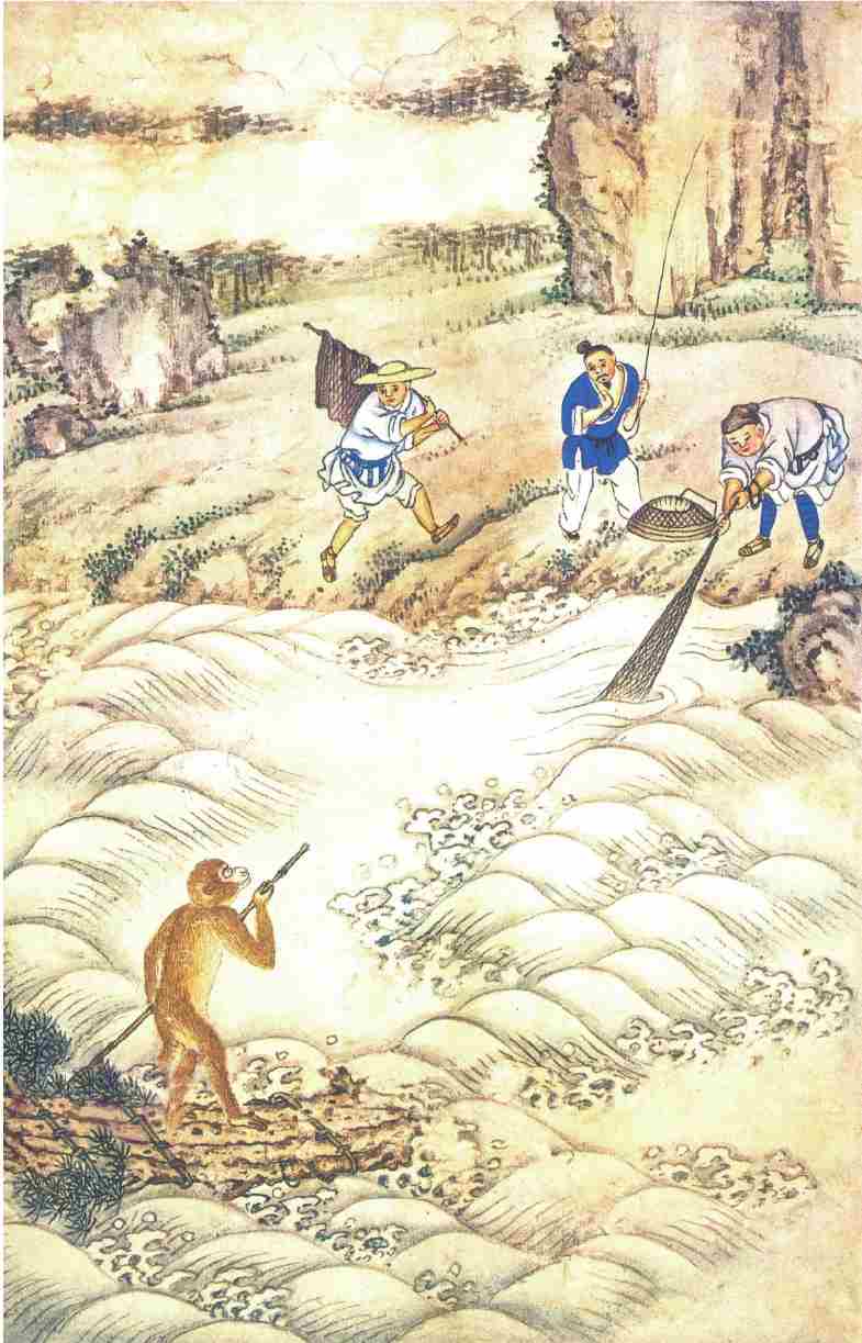 也是他运至时来,自登木筏之后,连日东南风紧,将他送到西北岸前,乃是南赡部洲地界。持篙试水,偶得浅水,弃了筏子,跳上岸来,只见海边上有人捕鱼、打雁、挖蛤、淘盐。他走近前,弄个把戏,妆个 虎,吓得那些人丢筐弃网,四散奔跑。将那跑不动的拿住一个,剥了他的衣裳,也学人穿在身上,摇摇摆摆,穿州过府,在于市廛中,学人礼,学人话。朝餐夜宿,一心里访问佛仙神圣之道,觅个长生不老之方。真真。见世人都是为名为利之徒,更无一个为身命者。正是那: