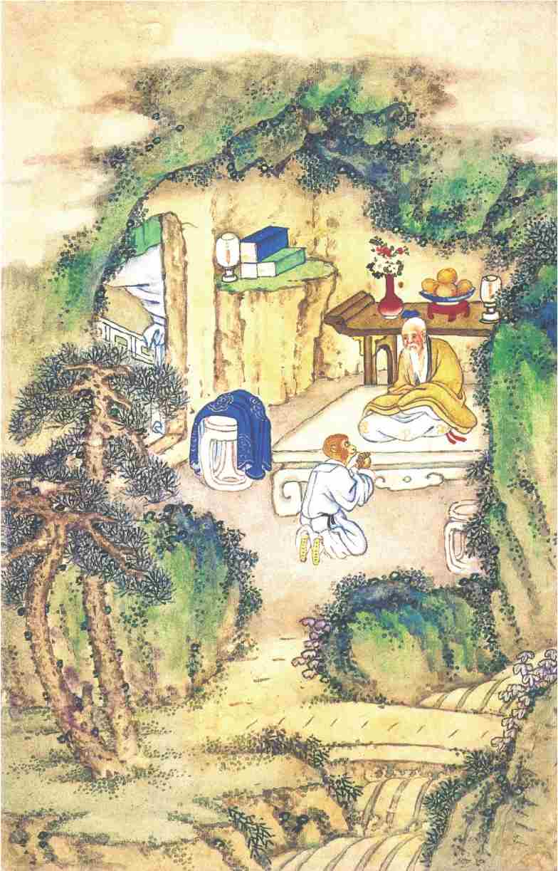 猴王道:“据你说起来,乃是一个行孝的君子,向后必有好处。但望你指与我那神仙住处,却好拜访去也。”樵夫道:“不远,不远。此山叫做灵台方寸山。灵台方寸,心也。一部《西游》,此是宗旨。山中有座斜月三星洞。斜月像一勾,三星像三点,也是心。言学仙不必在远,只在此心。那洞中有一个神仙,称名须菩提祖师。那祖师出去的徒弟,也不计其数,见今还有三四十人从他修行。你顺那条小路儿,向南行七八里远近,即是他家了。”猴王用手扯住樵夫道:“老兄,你便同我去去。若还得了好处,决不忘你指引之恩。”痴猴。樵夫道:“你这汉子,甚不通变。我方才这般与你说了,你还不省?假若我与你去了,却不误了我的生意?老母何人奉养?我要斫柴,你自去,自去。”