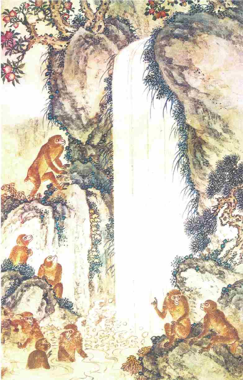 一群猴子耍了一会,却去那山涧中洗澡。见那股涧水奔流,真个似滚瓜涌溅。古云:“禽有禽言,兽有兽语。”众猴都道:“这股水不知是那里的水。我们今日赶闲无事,顺涧边往上溜头寻看源流,耍子去耶!”喊一声,都拖男挈女,呼弟呼兄,一齐跑来,顺涧爬山,直至源流之处,乃是一股瀑布飞泉。但见那: