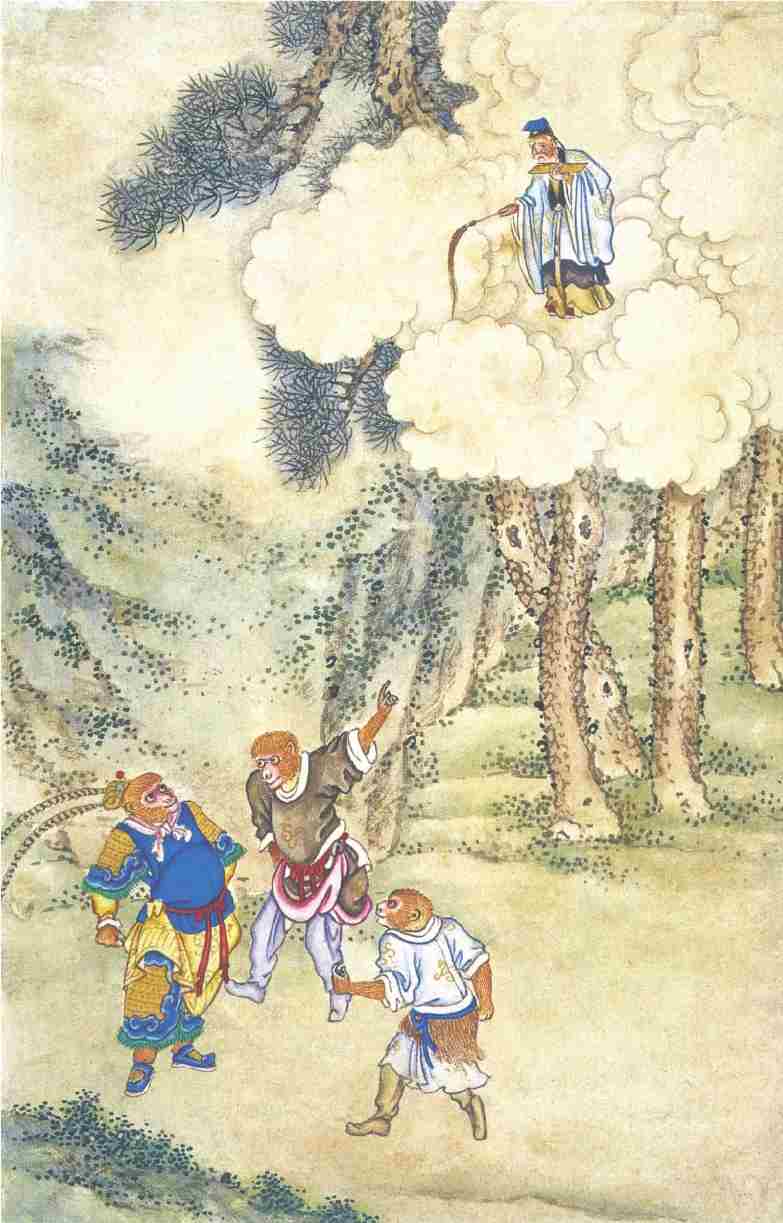 金星领了旨,出南天门外,按下祥云,直至花果山水帘洞。对众小猴道:“我乃天差天使,有圣旨在此,请你大王上界。快快报知!”洞外小猴,一层层传至洞天深处,道:“大王,外面有一老人,背着一角文书,言是上天差来的天使,有圣旨请你也。”美猴王听得大喜,道:“我这两日,正思量要上天走走,却就有天使来请。”叫:“快请进来!”猴王急整衣冠,门外迎接。金星径入当中,面南立定道:“我是西方太白金星,奉玉帝招安圣旨下界,请你上天,拜受仙箓。”悟空笑道:“多感老星降临。”教:“小的们!安排筵宴款待。”金星道:“圣旨在身,不敢久留;就请大王同往,待荣迁之后,再从容叙也。”悟空道:“承光顾,空退!空退!”即唤四健将,分付:“谨慎教演儿孙,待我上天去看看路,却好带你们上去同居住也。”四健将领诺。这猴王与金星纵起云头,升在空霄之上。正是那: