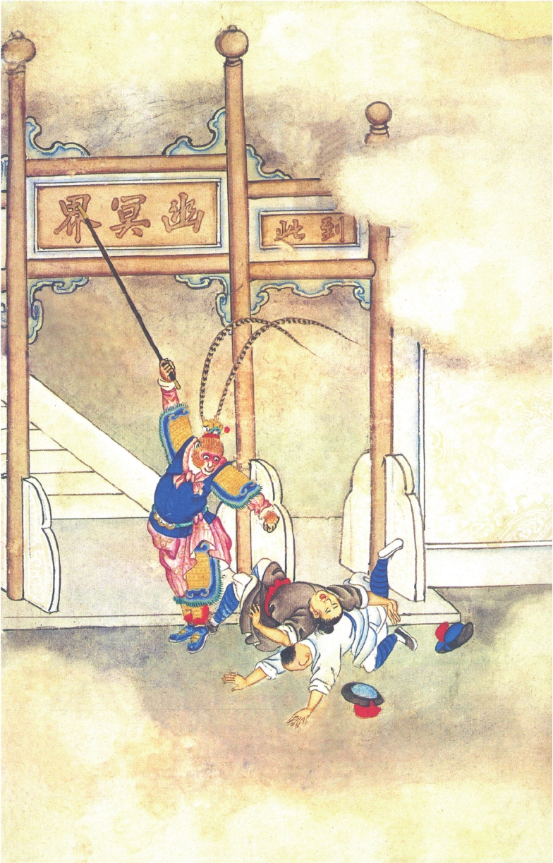 一日,在本洞分付四健将安排筵宴,请六王赴饮,杀牛宰马,祭天享地,着众怪跳舞欢歌,俱吃得酩酊大醉。送六王出去,都又赏劳大小头目,敧在铁板桥边松阴之下,霎时间睡着。四健将领众围护,不敢高声。只见那美猴王睡里见两人拿一张批文,上有“孙悟空”三字,走近身,不容分说,套上绳,就把美猴王的魂灵儿索了去,踉踉跄跄,直带到一座城边。猴王渐觉酒醒,忽抬头观看,那城上有一铁牌,牌上有三个大字,乃“幽冥界”。美猴王顿然醒悟道:“幽冥界乃阎王所居,何为到此?”那两人道:“你今阳寿该终,我两人领批,勾你来也。”猴王听说,道:“我老孙超出三界外,不在五行中,已不伏他管辖,怎么朦胧,又敢来勾我?”那两个勾死人只管扯扯拉拉,定要拖他进去。这猴王恼起性来,耳朵中掣出宝贝,幌一幌,碗来粗细;略举手,把两个勾死人打为肉酱。自解其索,丢开手,抡着棒,打入城中。唬得那牛头鬼东躲西藏,马面鬼南奔北跑。众鬼卒奔上森罗殿,报着:“大王!祸事!祸事!外面有一个毛脸雷公,打将来了!”