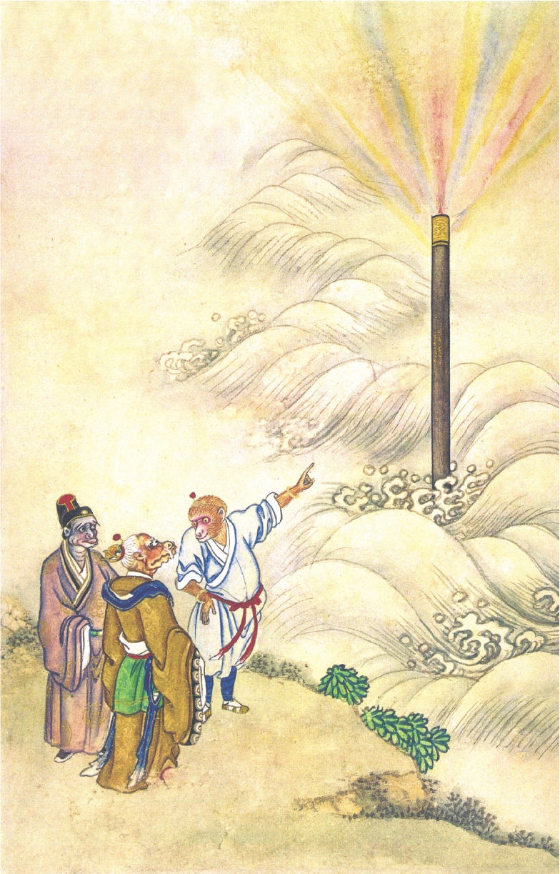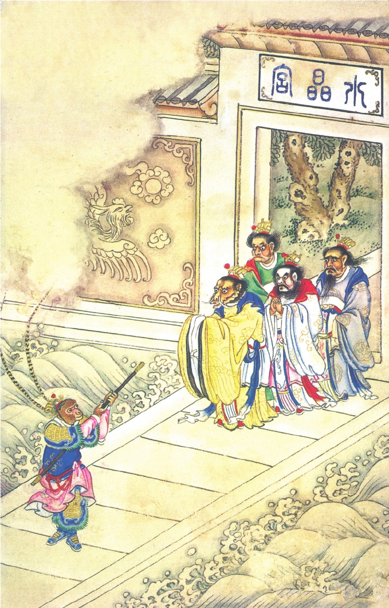 悟空执着如意棒,径登森罗殿上,正中间南面坐下。十王即命掌案的判官取出文簿来查。那判官不敢怠慢,便到司房里,捧出五六簿文书并十类簿子,逐一查看。裸虫、毛虫、羽虫、昆虫、鳞介之属,俱无他名。又看到猴属之类,原来这猴似人相,不入人名;似裸虫,不居国界;似走兽,不伏麒麟管;似飞禽,不受凤凰辖——另有个簿子。悟空亲自检阅,直到那魂字一千三百五十号上,方注着孙悟空名字,乃天产石猴,该寿三百四十二岁,善终。悟空道:“我也不记寿数几何,且只消了名字便罢!取笔过来!”爽利,的是妙人!那判官慌忙捧笔,饱掭浓墨。悟空拿过簿子,把猴属之类但有名者,一概勾之。捽下簿子道:“了帐!了帐!今番不伏你管了!”一路棒,打出幽冥界。那十王不敢相近,都去翠云宫同拜地藏王菩萨,商量启表,奏闻上天,不在话下。