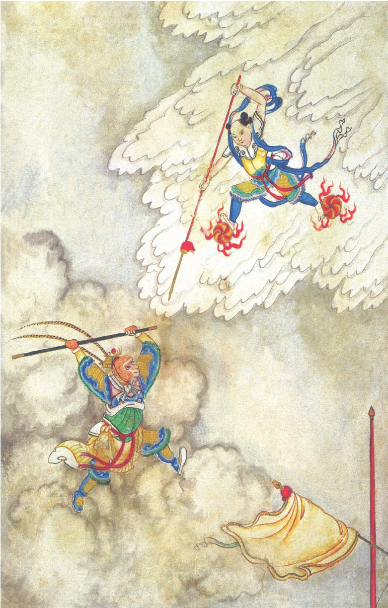 悟空迎近前来问曰:“你是谁家小哥?闯近吾门,有何事干?”哪吒喝道:“泼妖猴!岂不认得我?我乃托塔父王三太子哪吒是也。今奉玉帝钦差,至此捉你!”悟空笑道:“小太子,你的奶牙尚未退,胎毛尚未干,怎敢说这般大话?如今偏是奶牙未退、胎毛未干的会大话。我且留你的性命,不打你。你只看我旌旗上是甚么字号,拜上玉帝,是这般官衔,再也不须动众,我自皈依;若是不遂我心,定要打上灵霄宝殿。”哪吒抬头看处,乃“齐天大圣”四字。哪吒道:“这妖猴能有多大神通,就敢称此名号!不要怕!吃吾一剑!”悟空道:“我只站下不动,任你砍几剑罢。”猴!那哪吒奋怒,大喝一声叫:“变!”即变做三头六臂,恶狠狠,手持着六般兵器,乃是斩妖剑、砍妖刀、缚妖索、降妖杵、绣球儿、火轮儿,丫丫叉叉,扑面来打。悟空见了,心惊道:“这小哥倒也会弄些手段!莫无礼,看我神通!”好大圣,喝声:“变!”也变做三头六臂,把金箍棒幌一幌,也变作三条,六只手拿着三条棒架住。这场斗,真个是地动山摇,好杀也:
