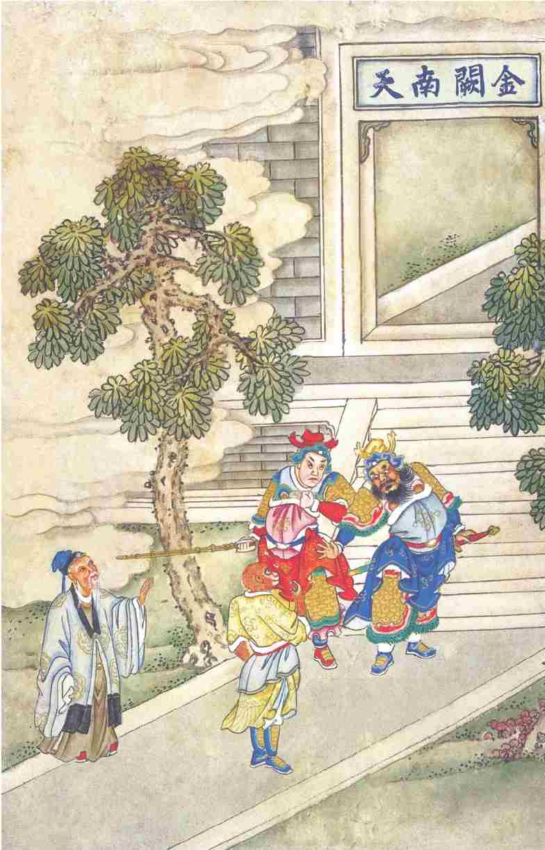 那太白金星与美猴王,同出了洞天深处,一齐驾云而起。原来悟空筋斗云比众不同,十分快疾,把个金星撇在脑后,先至南天门外。正欲收云前进,被增长天王领着庞、刘、苟、毕、邓、辛、张、陶,一路大力天丁,枪刀剑戟,挡住天门,不肯放进。猴王道:“这个金星老儿,乃奸诈之徒!既请老孙,如何教人动刀动枪,阻塞门路?”正嚷间,金星倏到。悟空就觌面发狠道:“你这老儿,怎么哄我?被你说奉玉帝招安旨意来请,却怎么教这些人阻住天门,不放老孙进去?”金星笑道:“大王息怒。你自来未曾到此天堂,却又无名,众天丁又与你素不相识,他怎肯放你擅入?等如今见了天尊,授了仙箓,注了官名,向后随你出入,谁复挡也?”悟空道:“这等说,也罢,我不进去了。”金星又用手扯住道:“你还同我进去。”