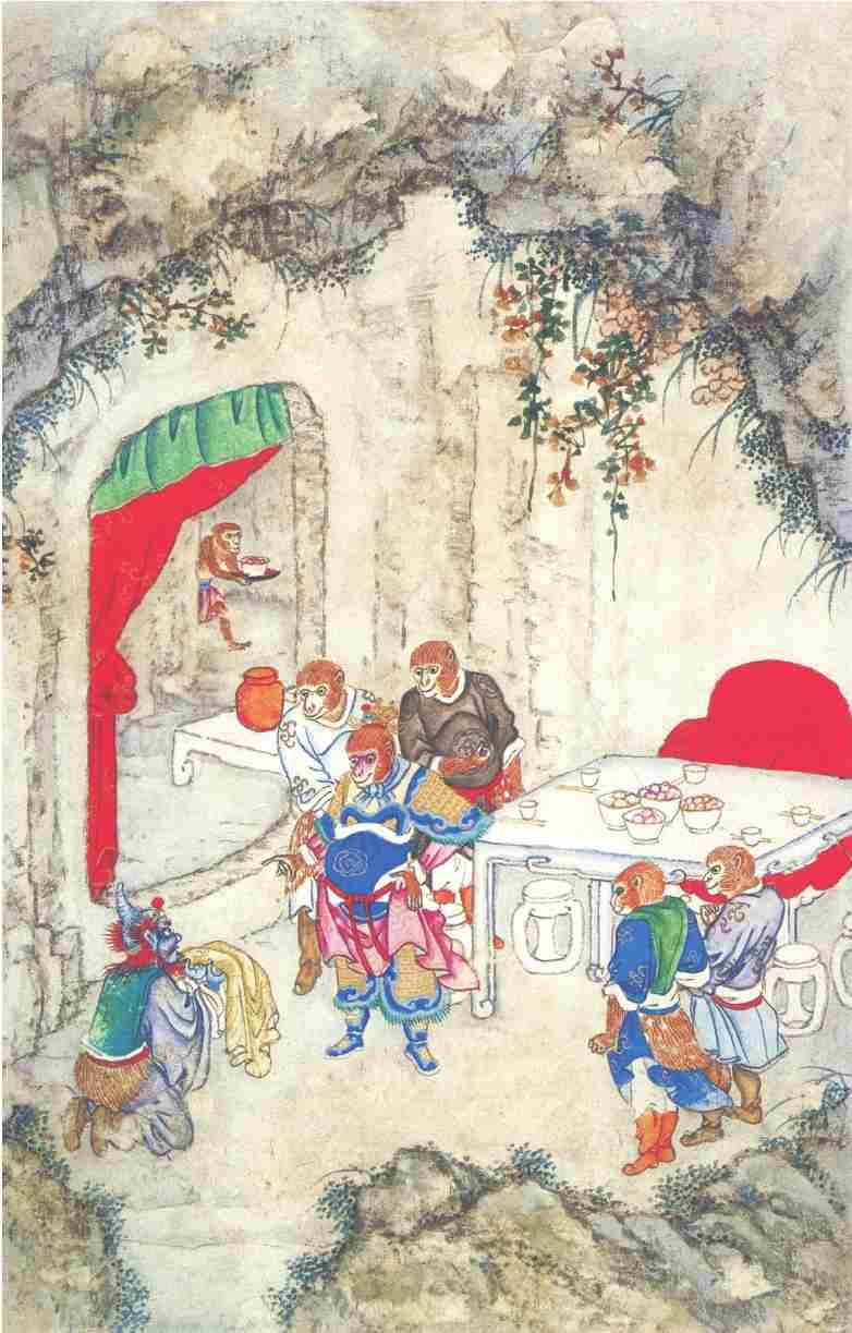 须臾,按落云头,回至花果山上。只见那四健将与各洞妖王,在那里操演兵卒。这猴王厉声高叫道:“小的们!老孙来了!”一群猴都来叩头,迎接进洞天深处,请猴王高登宝位,一壁厢办酒接风。都道:“恭喜大王,上界去十数年,想必得意荣归也?”猴王道:“我才半月有馀,那里有十数年?”众猴道:“大王,你在天上,不觉时辰。天上一日,就是下界一年哩。请问大王,官居何职?”猴王摇手道:“不好说!不好说!活活的羞杀人!那玉帝不会用人,玉帝也不会用人,奈何!他见老孙这般模样,封我做个甚么‘弼马温’,原来是与他养马,未入流品之类。我初到任时不知,只在御马监中顽耍。只今日问我同寮,始知是这等卑贱。老孙心中大恼,推倒席面,不受官衔,因此走下来了。”众猴道:“来得好!来得好!大王在这福地洞天之处为王,多少尊重快乐,怎么肯去与他做马夫?”教:“小的们!快办酒来,与大王释闷。”