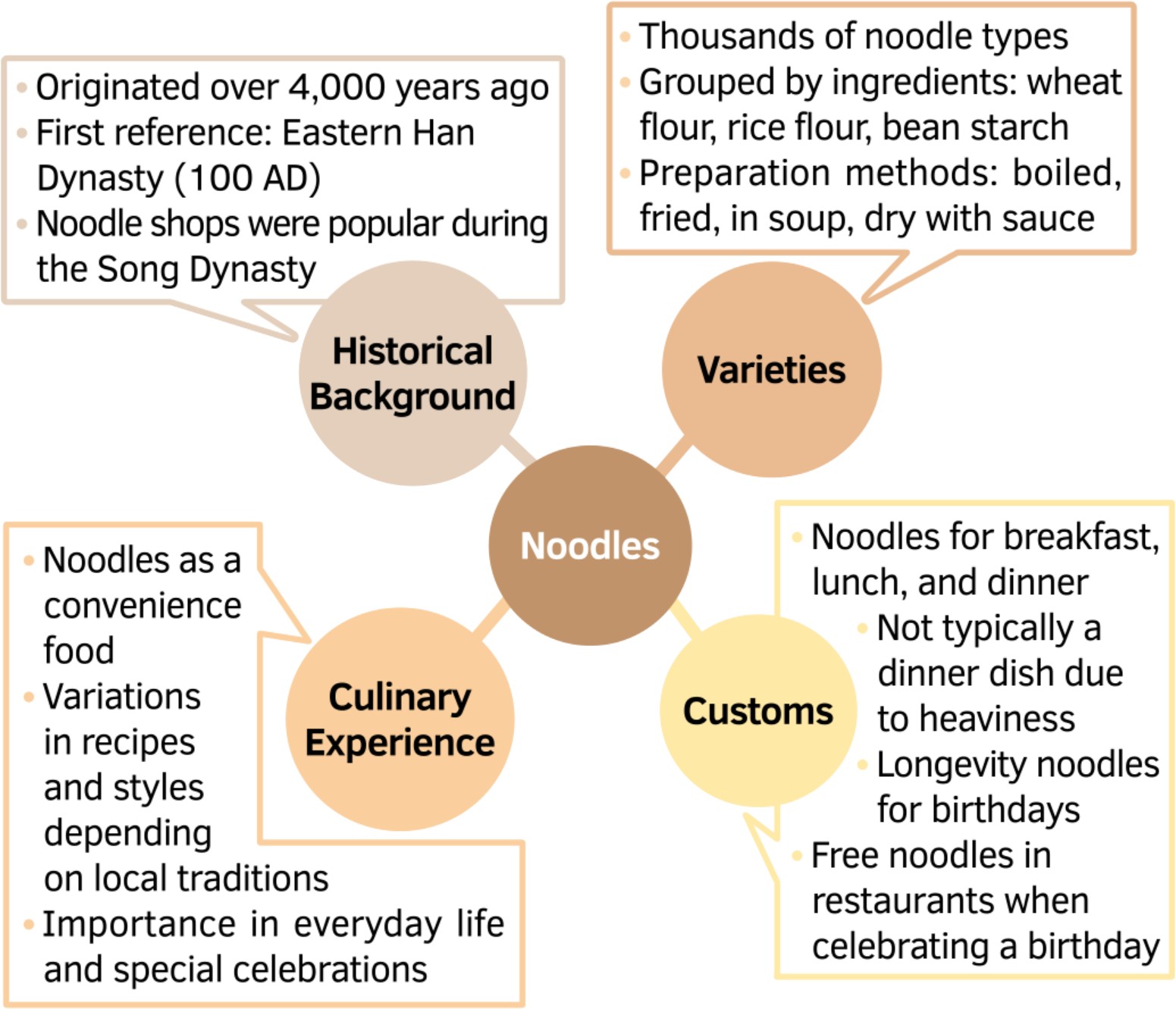 Look at the mind map below and try to introduce Chinese noodles in English.