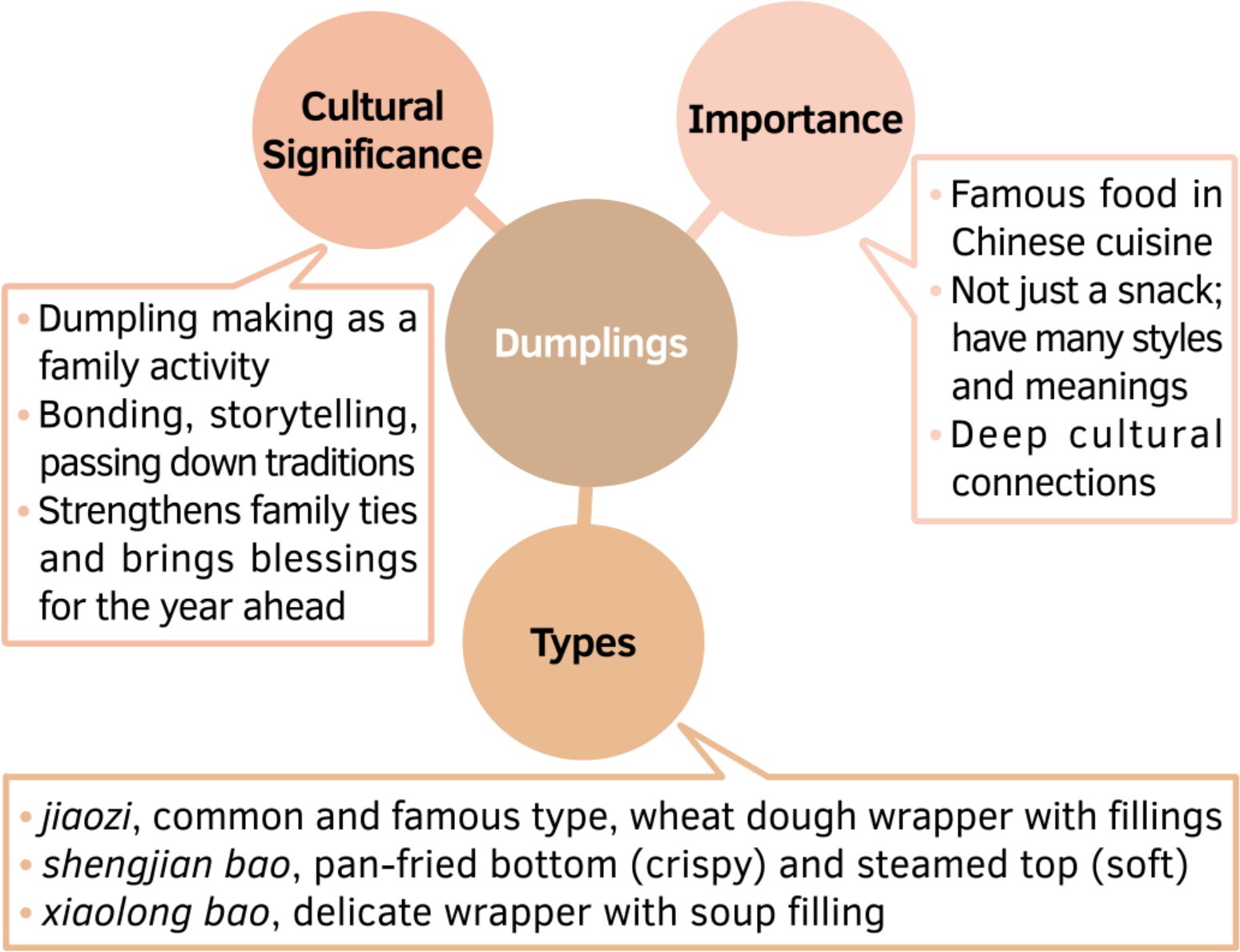 Look at the mind map below and try to introduce the typical Chinese food, dumplings, in English.