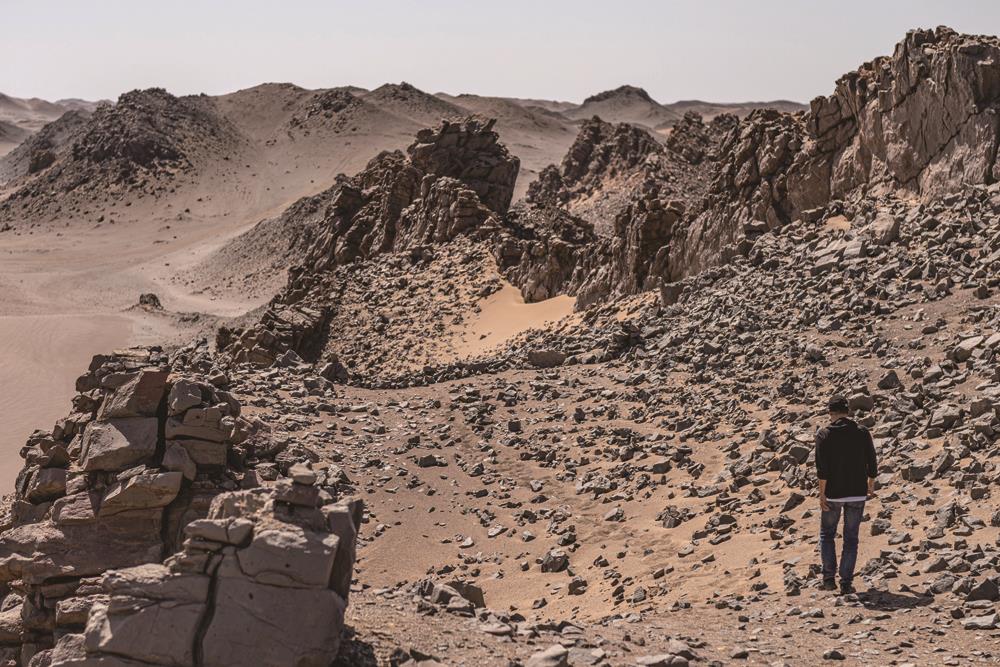 我们到达的地方是大海道中一片类似火星地貌的区域,这是一片几亿年前的火山喷发区。青黑色的山头点缀在沙海中,居然让人产生江南山水的幻觉。这里的核心地点叫火星长城,在经过亿万年侵蚀之后,山体剥落,留下一些巨大的石块,像废弃的长城一样,绵延好几千米,神秘而壮观。在周边的沙地里,散落着很多晶莹剔透的白色石子,那是遍地的玛瑙。