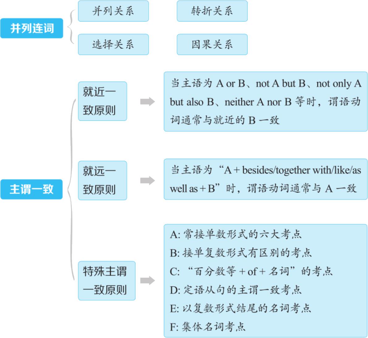 答: 并列连词考点主要有四类,主谓一致考点主要有三类。请看超级记忆导图: