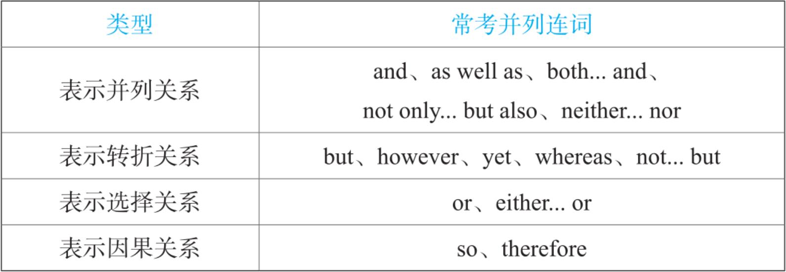 答: 常考的并列连词有四类,分别表示并列、转折、选择和因果关系。详见下表: