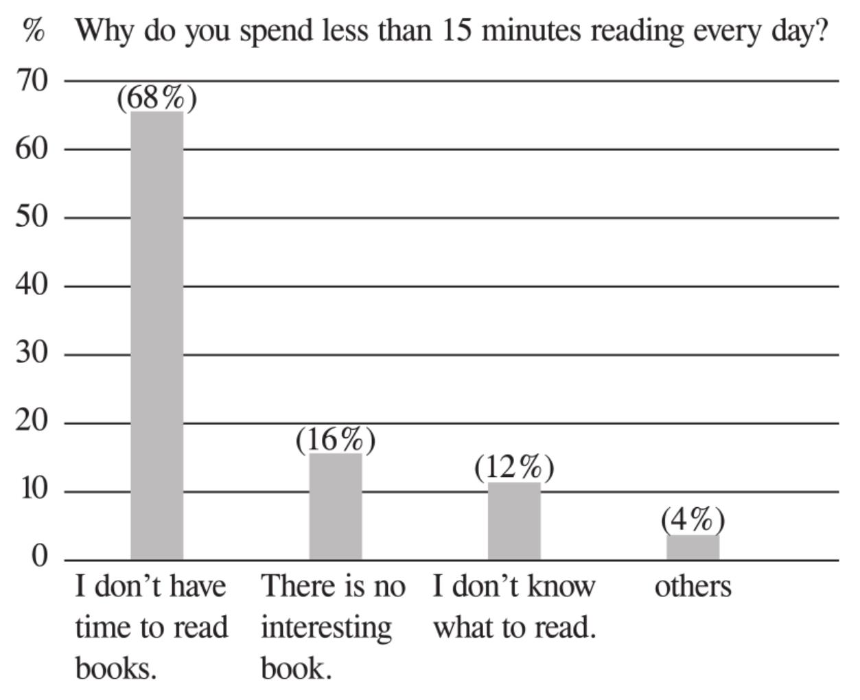 【重庆卷】 某权威英语阅读网站发布报告:从小学到高中毕业,如每天坚持阅读15分钟,学生的累积阅读量可达680万词;不足15分钟,则只有约150万词。你校英语社团在全校每天阅读时间不足15分钟的学生中进行原因调查后(结果见下图),针对最突出的原因,以“Everyone can have time to read”为主题发起征文。请你简述调查结果,提出行之有效的建议(1~2条)参与投稿。