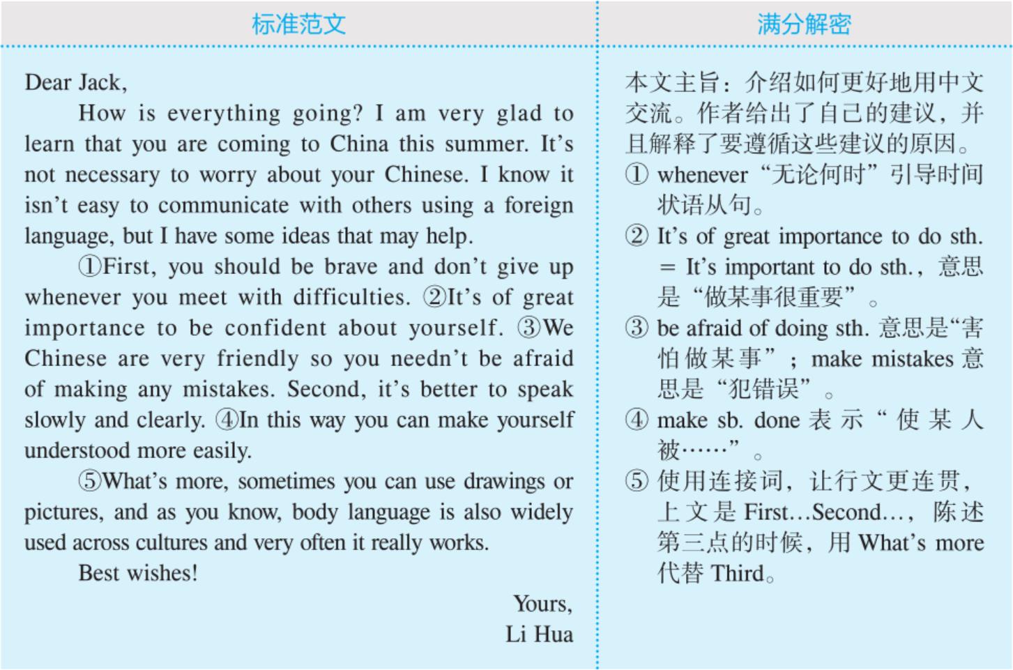 【安徽卷】 假设你是李华,你的美国朋友Jack来信,说他暑假期间要来中国交流学习。他学了两年中文,但是仍然担心用中文交流时会遇到困难。请你用英语给Jack写封回信,提几点建议,要点如下: