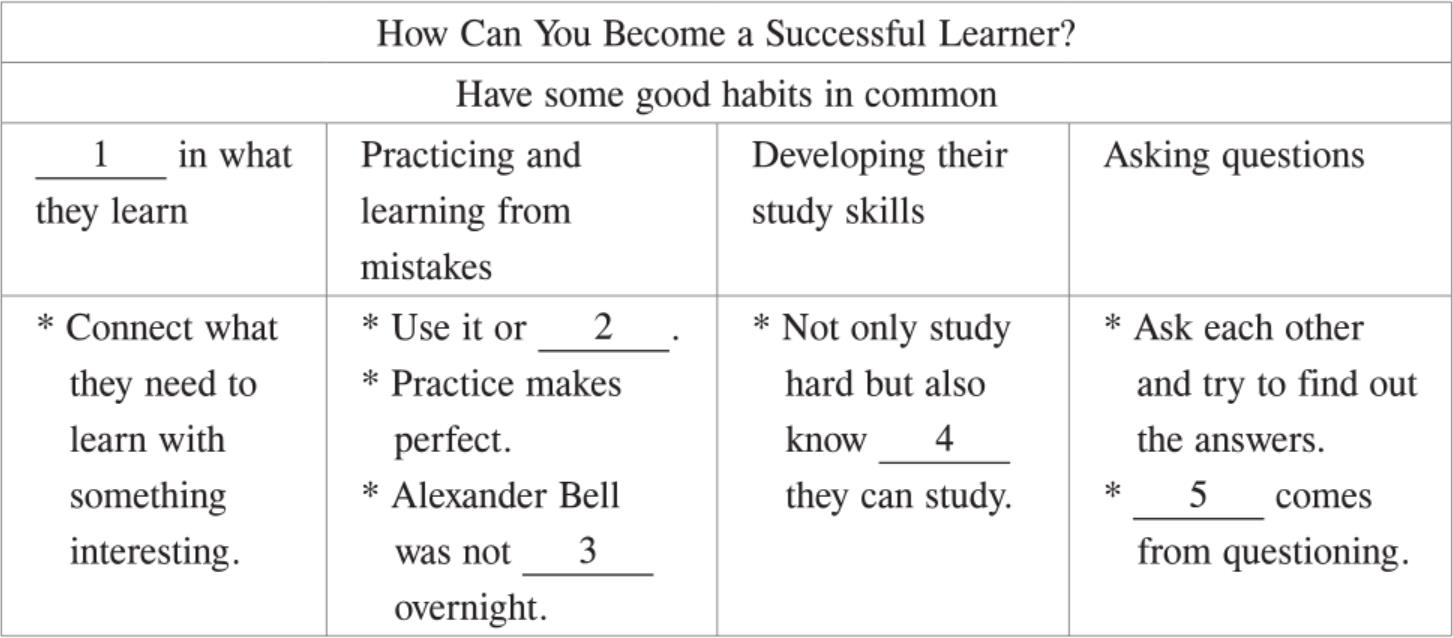 Good learners think about what they are good at and what they need to practice more.Remember,“Use it or lose it.” Even if you learn something well,you will forget it unless you use it.“Practice makes perfect.” Good learners will keep practicing what they have learned,and they are not afraid of making mistakes.Alexander Graham Bell did not invent the telephone overnight.He succeeded by trying many times and learning from his mistakes.