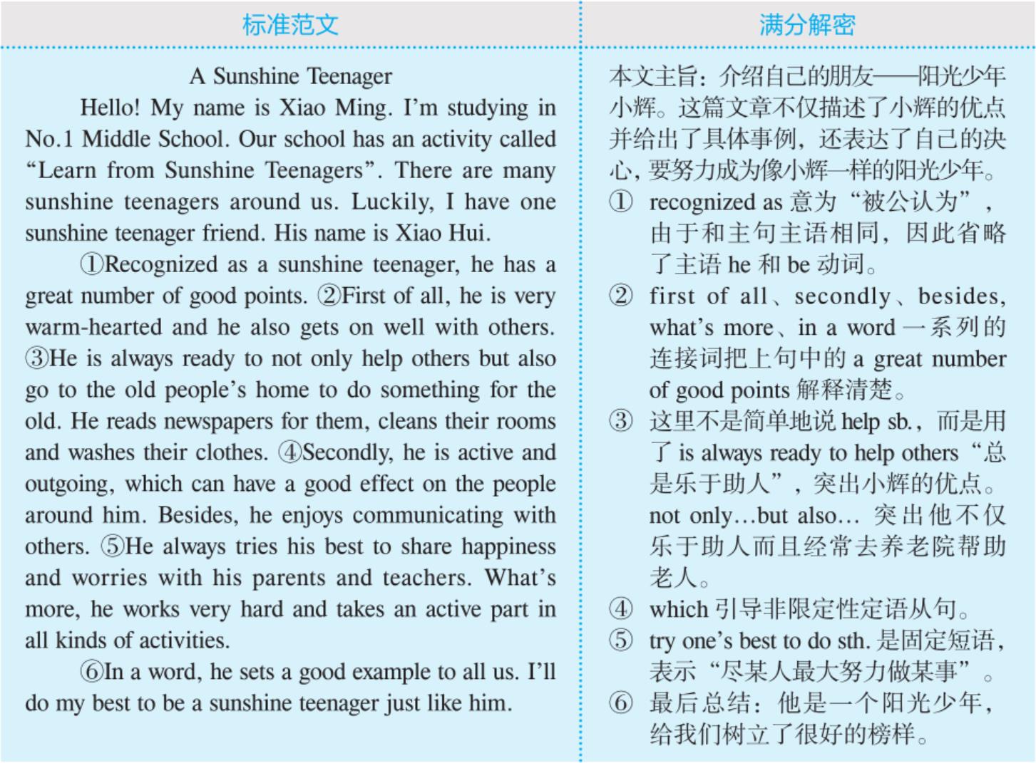 Hello! My name is Xiao Ming.I'm studying in No.1 Middle School.Our school has an activity “Learn from Sunshine Teenagers”.There are many sunshine teenagers around us.(1)_________,I have one sunshine teenager friend.His name is Xiao Hui.
