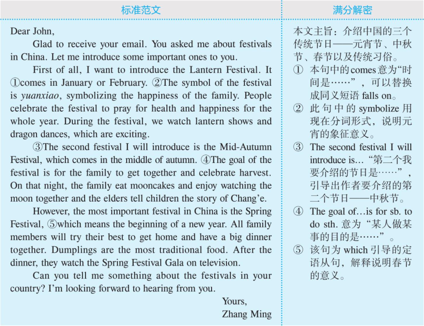 【山东卷】 假设你叫张明,你的外国朋友John发来邮件,请你介绍中国的传统节日。请根据表格中内容提示及要求给他写一封80~100词的回信。