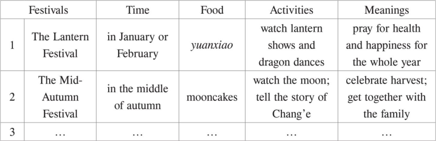 1.描述节日1和节日2,并自主选择节日3 进行介绍,包括节日名称、时间、美食、活动方式及意义等;