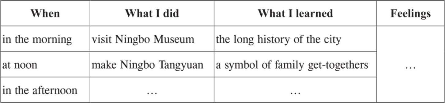 【浙江宁波卷】 为了弘扬传统文化,你校结合“宁波元素”在今年5月19日(中国旅游日)开展了丰富多彩的文化活动(cultural activities)。假如你是李华,请根据表格中的信息并结合自身经历,写一篇英语短文向学校英语报投稿。
