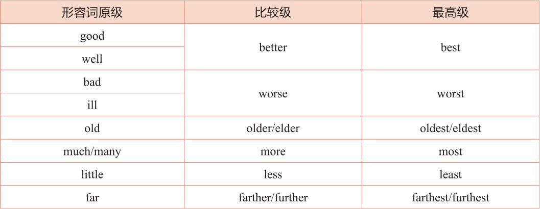 下表总结了高考中常见的形容词比较级和最高级的不规则变化: