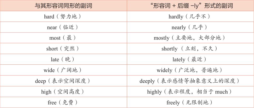 高考中某些副词有两种形式,一种形式与其形容词形式同形,另一种形式是形容词带后缀-ly,在使用中要特别留意两者在意思上的差异。高考中常见的类似副词主要有以下几组: