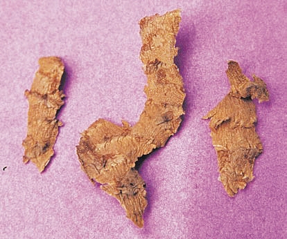 生姜皮: 为生姜根茎切下的外皮(图4c)。性状呈不规则的卷缩状碎片,外表面灰黄色,具细皱纹,有的可见环节痕迹,内表面常见黄色油点。质软,有特殊香气。