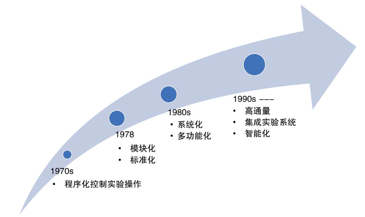 化学的发展为医药、材料、信息等领域的发展提供了物质基础。当我们在寻找续航能力更长的新能源电池、治疗疾病的药物、可降解塑料或任何其他具有我们预期特性的新物质或新材料时,都会用到化学。如前文所述,结合人工智能技术,研究人员已开发出一系列适用于物质或材料的快速、高效设计与预测的技术平台——高通量计算,即在计算机上完成材料的设计工作。但无论如何,设计出的新物质或新材料还需要实验人员去亲自动手制备、验证。合成化学就是创造出这些物质与材料的重要手段,但是,与高通量计算设计不同的是,大多数实验室中的物质合成这一关键环节尚停留在手工操作阶段。一定程度上讲,化学实验就像近代炼金术,研究人员每天在实验室中操作试管、烧瓶和加热装置,通过反复的尝试来完成新物质的创造工作。这意味着,整个研究过程需要大量的人力成本,进而影响了研究效率。与此同时,长时间、重复、枯燥的工作容易导致研究人员的生理疲惫,存在实验安全隐患。若能在化学实验室中引入自动化的实验技术,制造一个行动灵活、神通广大、任劳任怨的化学合成机器人,则有望将研究人员从大量、冗长的重复性工作中解放出来,从而更好地开展创造性的脑力劳动。事实上,早在20世纪70年代,已经有化学家尝试实现在化学实验室中引入自动化的想法,随后逐步发展成了自动化试验技术,期望在不久的将来具备人类智能的化学合成机器人能够在各个实验室大展身手。