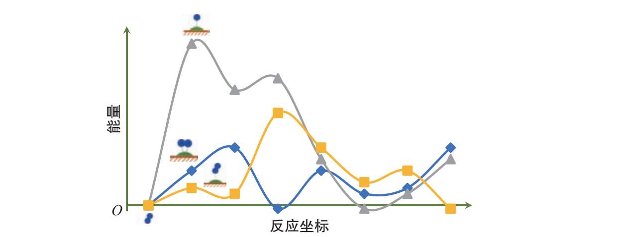 化学反应是化学中最奇妙的物质与能量变化过程,其本质就是旧的化学键断裂、新的化学键形成。化学反应过程如同积木游戏一样,每一个原子或者是官能团相当于一块独特的“积木”,它们可以与其他的“积木”通过形成新的化学键的方式拼接、组合,直至形成新的形状,制造出一个新的分子。所以,化学反应的研究需要解决两个方面的问题:一是探索各式各样的原子或官能团(积木)的拼接方法与方式,以提高化学反应产物的收率和选择性;二是揭秘反应过程中不同原子或官能团(积木)是如何通过化学键连接起来的。前者可以促进我们以更低成本、更高效率来合成益于人类的分子或物质,例如药物或功能材料等。而后者将帮助人们建立化学反应的微观机理,带着理性的思维方式设计和调控化学反应,可以减少实验试错的耗费,加速新反应的发现。但是,化学反应微观过程的高度复杂性超乎我们的想象。我们以最重要的反应之一合成氨反应为例,此反应通常以3H 2 +N 2 →2NH 3 这样一个简单的通式来表达这个过程,但实际上这一个反应的发生经历了许多个基元反应步骤,涉及多个过渡态(即旧化学键没有完全断裂,新化学键没有完成形成的中间态)。我们可以将上述化学反应想象成反应物分子“翻山越岭”的过程(图1-4),目标产物的生成需要翻越很多个山岭,每翻一个山岭就是一个基元反应,每个山岭的最高点就是反应过渡态,其高度(也就是能量值)决定了一个反应的速率、反应的难易程度和反应发生所需具备的条件。同时,由于从起点出发可能会有许多个“分岔路口”(反应路径)并存,这意味着化学反应有时并不会完全按照我们期望的方向进行,而是会通过其他的路径形成副产物。多个反应步骤以及各种竞争反应路径等问题大大增加了我们设计和发现反应的难度。随着人工智能技术的蓬勃发展,结合大数据和人工智能的化学反应设计将为化学反应的研究带来新的契机。