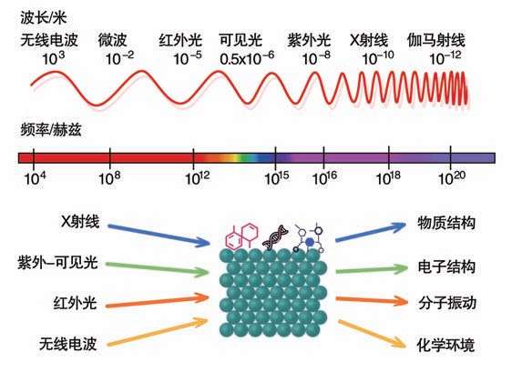 不同波长的电磁波会在物质内部引起电子跃迁、分子振动等变化,使得物质可以释放出各种响应信号;通过记录和分析这些信号,人们就可以知晓物质与电磁波的相互作用,并借此分析物质的结构、成分等性质,这一技术被称为波谱分析。从牛顿开始,波谱分析一直都是人类探索物质微观结构、发现物质规律乃至进行星际探索 [5] 的重要手段。比如,X射线的波长与材料的原子间距相仿,因此会在材料原子间发生衍射,借助其衍射光谱可以帮助我们了解材料的微观结构;紫外-可见光波段的电磁辐射可以引起电子系统的跃迁,得到的相应吸收光谱反映了物质的电子结构;红外光波段的电磁波频率与分子和材料的振动频率接近,由此发展而来的拉曼光谱和红外吸收光谱可以准确反映物质的振动信息,可用于物质种类鉴别和含量分析;更远波段的无线电波则与原子核跃迁的能量接近,基于此原理发展而来的核磁共振成像技术可以分辨原子的化学环境,在成分分析、医疗诊断上应用广泛(图1-6)。