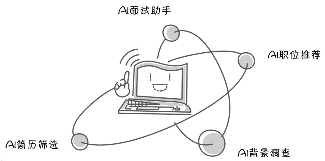 从本质上说,“AI面试官”只是企业招聘面试过程中的一个工具,面试的主体仍然是人。如图1-1所示,从简历筛选、面试助手、职位推荐到背景调查,AI以数据为基础,重塑了求职者与企业的互动模式。