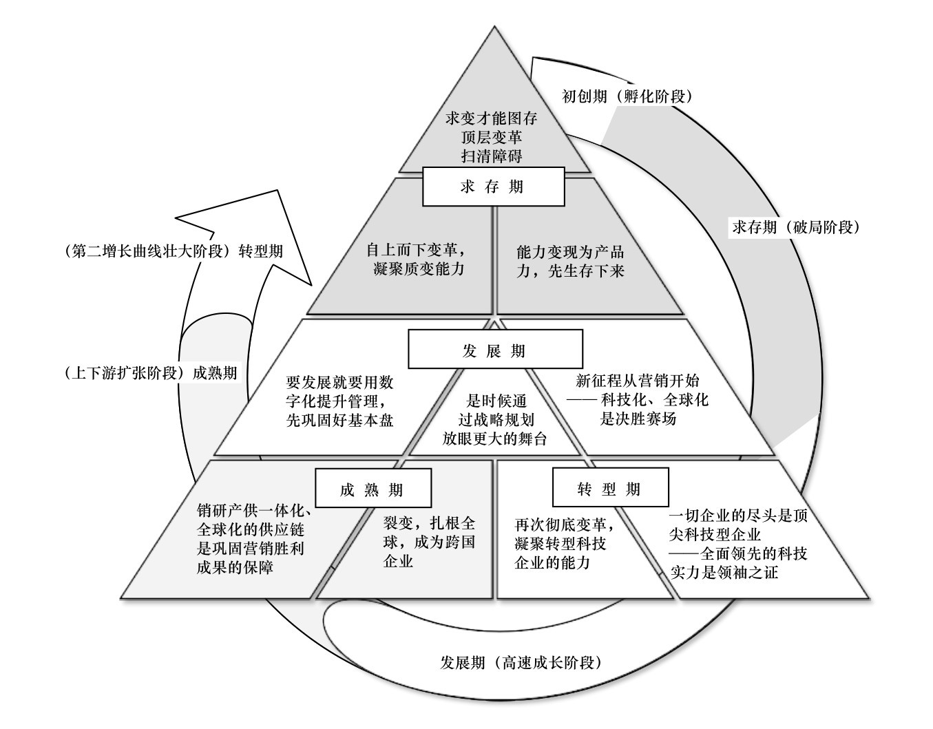 本书将这套机制的内容及企业运用其产生的变革能力不断进化,映射进企业生命周期来进行展示(见图0-1),让读者可以通过企业发展逻辑来理解该机制如何发挥作用,其产生的能力如何解决难题(如外部资源聚合、内部活力激活、跨界竞争、全球化、企业数智化转型),同时也方便不同企业根据生命周期进行对照,从中找到能够解决自身问题的办法。