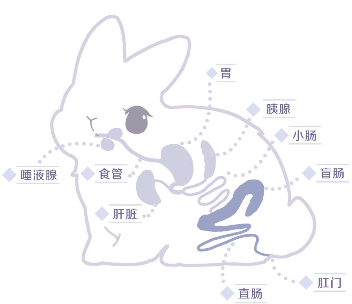 兔兔的消化系统比较简单,包含食管、胰腺、胃、小肠等。为了让兔兔健康地生活,尤其要注意对兔兔肠胃的保护。除了提供优质的饲料外,也应当让兔兔适量摄入一些乳酸菌等来丰富兔兔的肠道菌群,提高其消化能力。兔兔有时因情绪过于紧张、压力太大,也会患消化道疾病,所以轻松的生活环境对兔兔来说也十分重要。