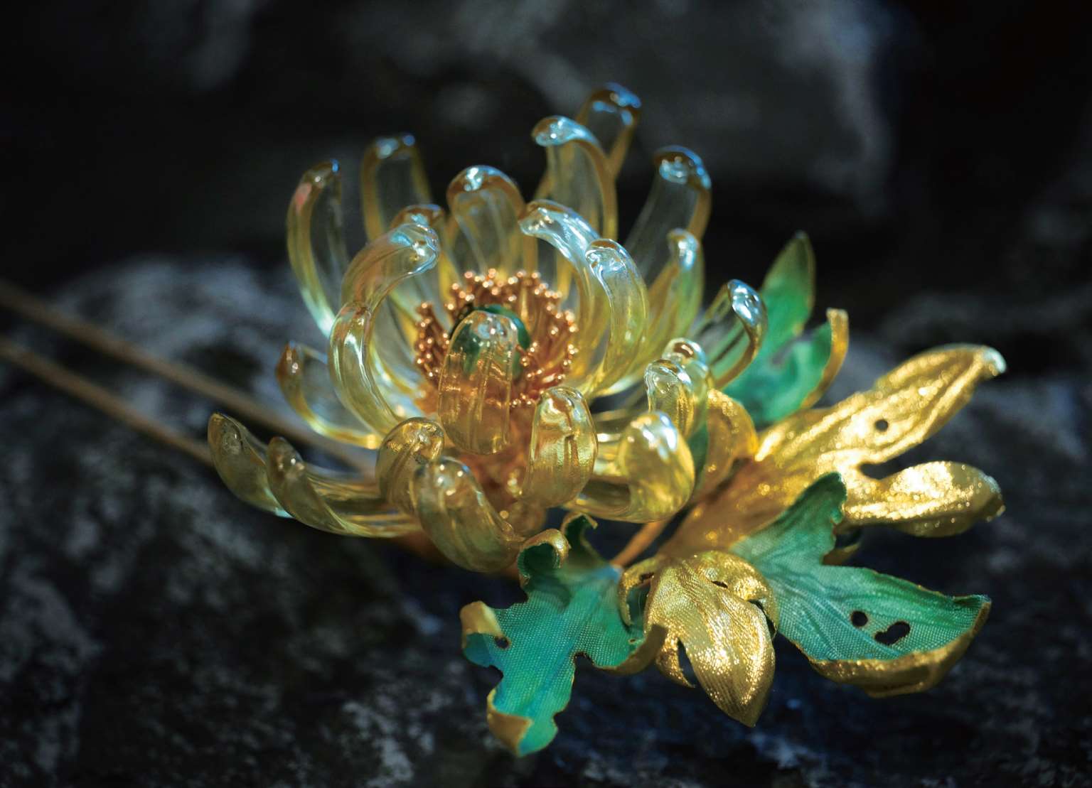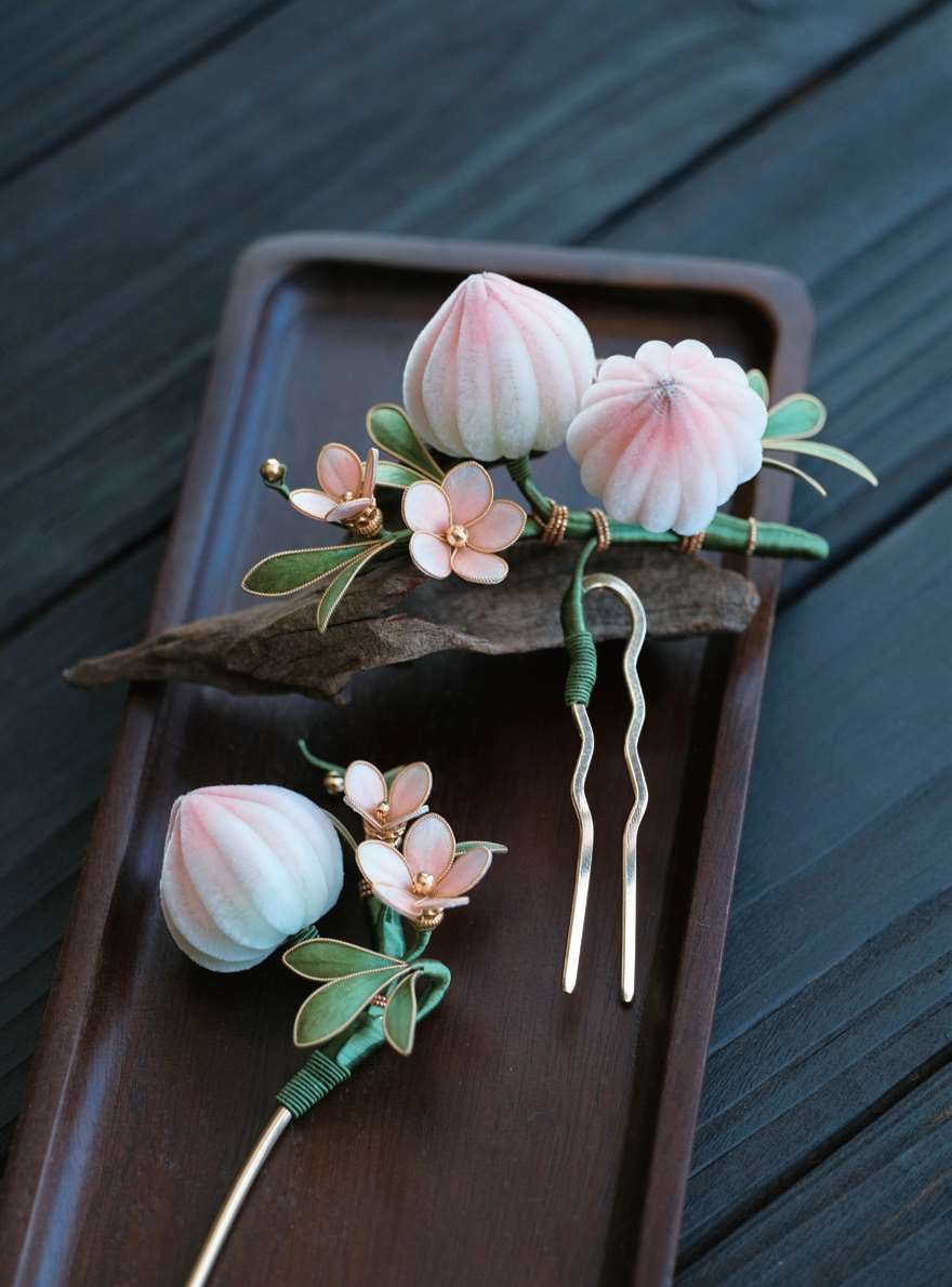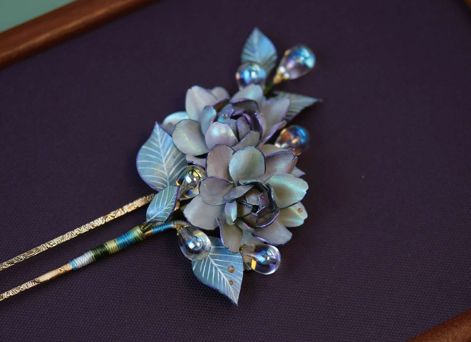 料器是一种琉璃艺术,也是国家级非物质文化遗产之一。料器在以前通常是作为小摆件和装饰盆景来制作,由于光泽剔透,质地温润,现在也常被用来制作发饰。将料器的花瓣、叶片组合后绑在发簪主体上,制作非常方便。
