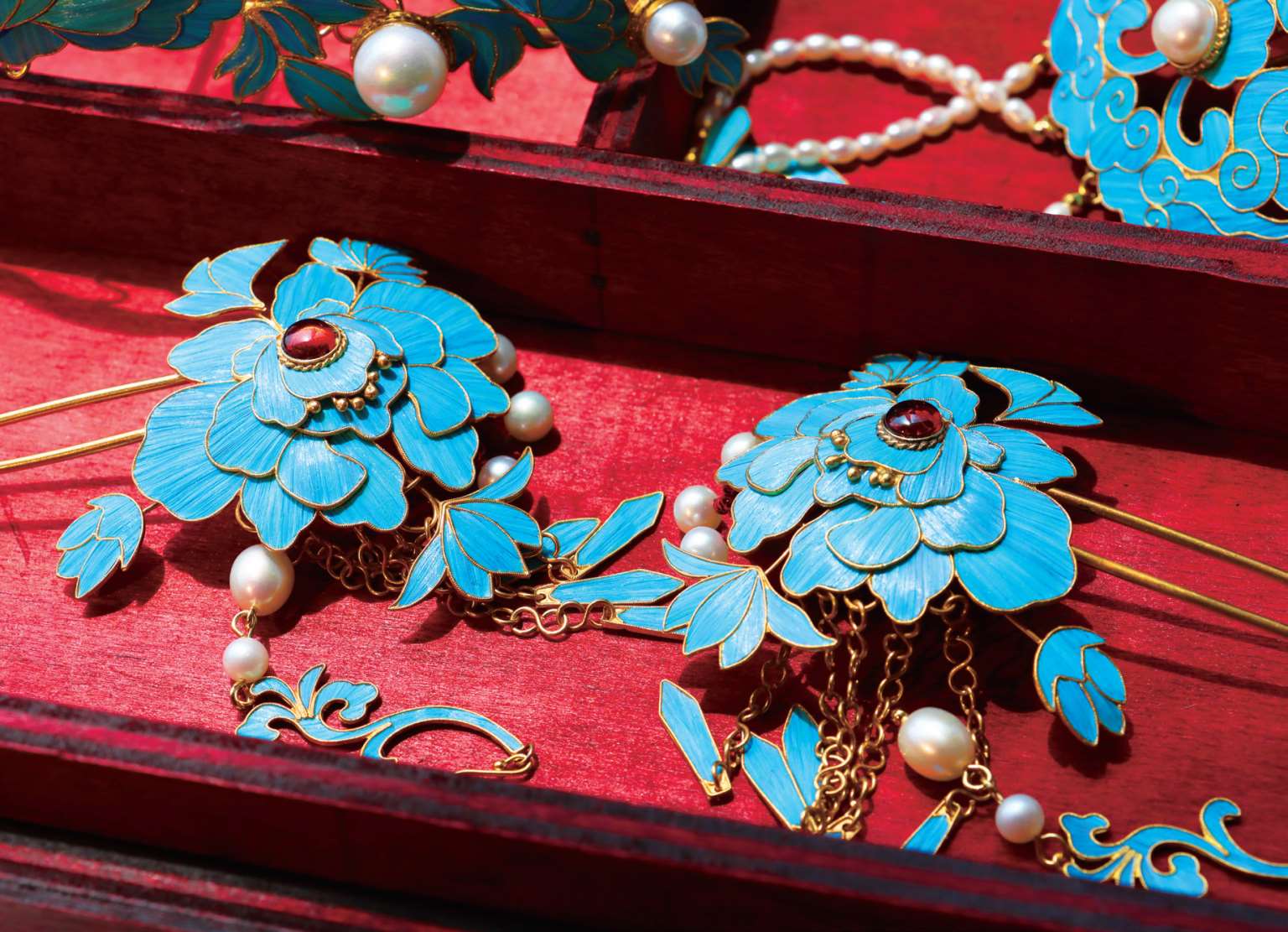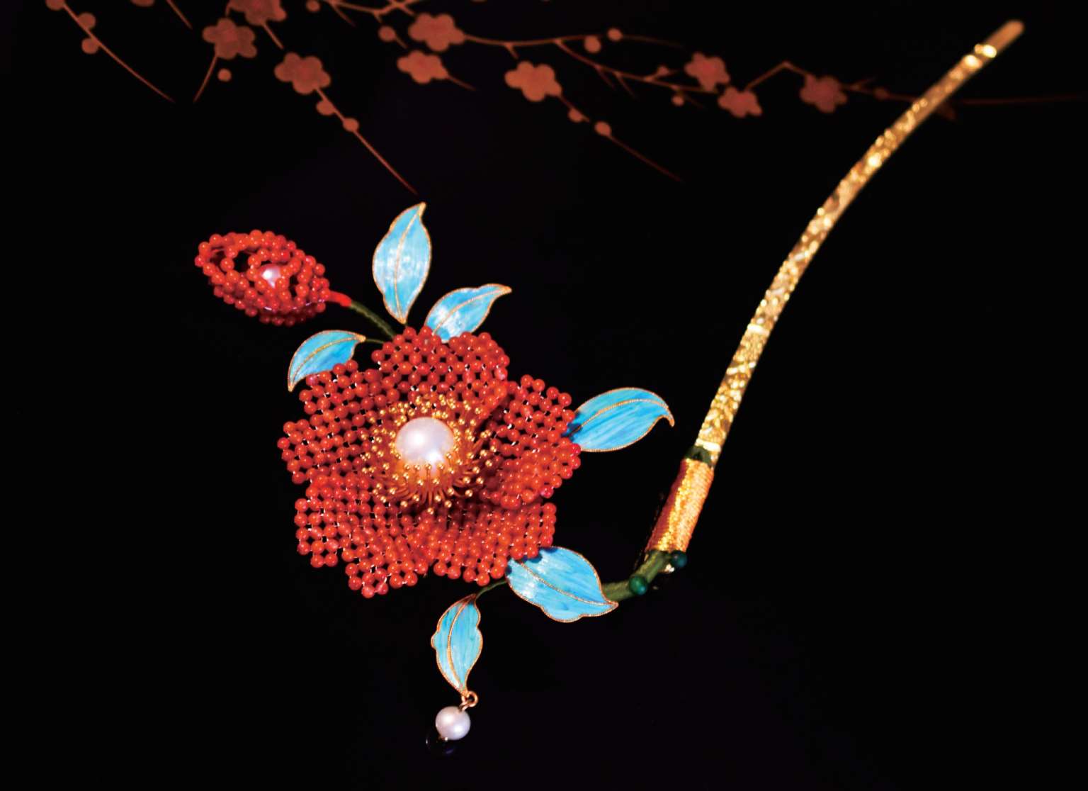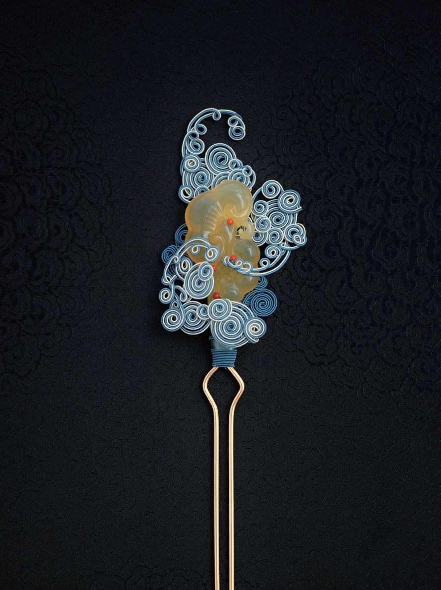 花丝镶嵌是中国传统手工艺,是将金银等贵重金属加工成细丝,以推垒、掐丝、编织、火焊等技艺来造型,还可以镶嵌珠玉、宝石来进行搭配。很多花丝镶嵌的发簪会和点翠工艺结合,就是将翠鸟背部亮丽的蓝色羽毛仔细地镶嵌在底胎上。然而翠鸟现已是国家保护动物,目前的点翠技法均采用代替品,如染色鹅毛,自然脱落的孔雀羽、鹦鹉羽或是缎面丝带,同样精美夺目。