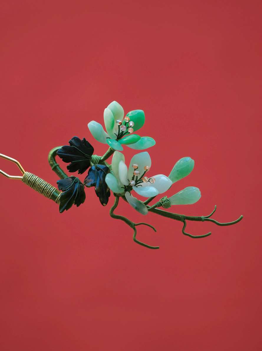 将天然石雕刻成花瓣、叶片、蝴蝶等形状后,再组装成簪花,视觉效果华丽、通透,常用材料有翡翠、水晶、玛瑙等,故天然石簪钗与其他簪钗相比,通常更具重量。