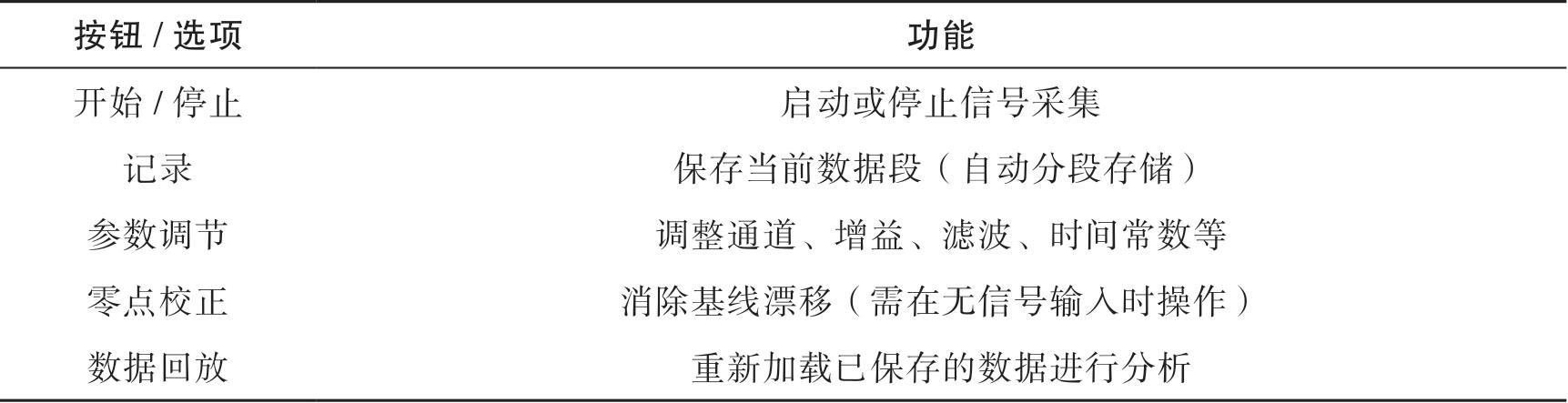 (2)调零和定标操作:实验前需进行调零和定标操作。调零是为了消除生物信号放大器正常范围内的直流零点偏移;定标是为了确定引入传感器的生物非电信号和该信号通过传感器后换能得到的电压信号之间的比值,通过此比值可计算出传感器引入的生物非电信号的真实大小。