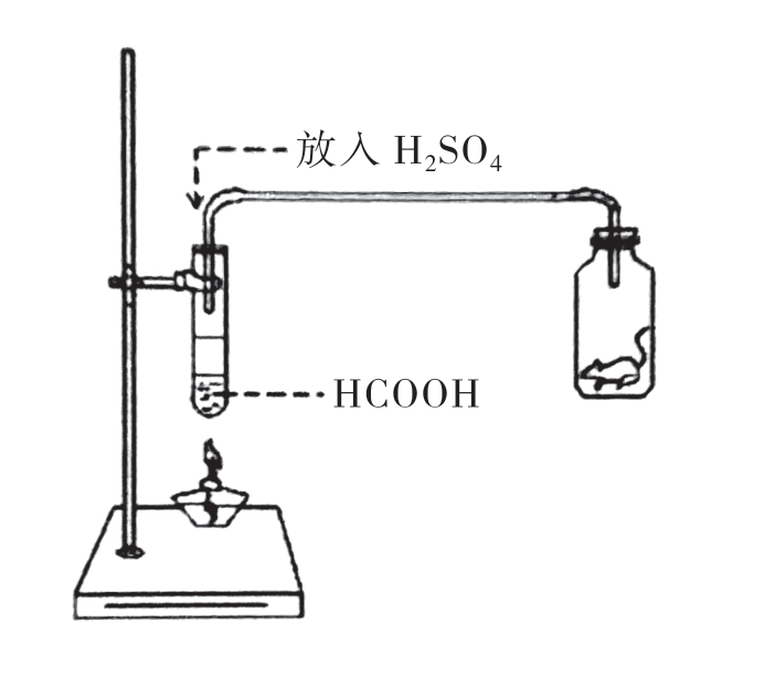 3.将3mL甲酸放入试管内,加入2mL浓硫酸,塞紧瓶塞。若CO产生不足,可用酒精灯加热以加速CO的产生。