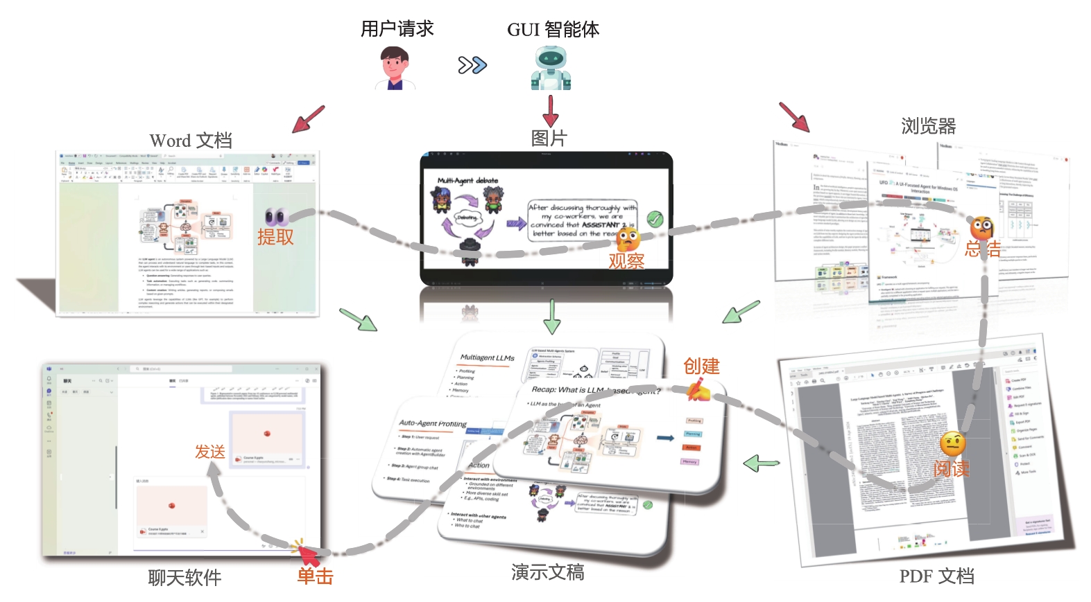 如图1-2所示,GUI智能体可以接收用户的自然语言请求,并在多个应用之间无缝协同操作:从Word文档中提取信息、查看图片中的内容、总结浏览器中的网页、阅读PDF文档、在PowerPoint中创建演示文稿,并通过聊天软件发送。在这种新范式下,用户的自然语言指令可以直接转化为对GUI组件的识别、单击、输入和拖曳等操作,大幅提高了图形交互的智能化与自动化水平。与近年流行的API型智能体相比,GUI智能体无须依赖内部或私有的API,而是利用广泛、通用的图形界面实现跨平台操作,因而在广度与适配性上具有极大的优势。实际上,GUI智能体提供了更通用的机制,能在不同软件和操作系统上进行非侵入式控制,为广大开发者提供了在现有应用之上构建增量功能的可能性,也为未来的智能自动化应用奠定了坚实的基础。由此可见,大语言模型驱动的GUI智能体在任务自动化、用户体验与软件生态扩展方面具有重要意义,极有可能成为下一代智能自动化与人机交互的中坚力量。