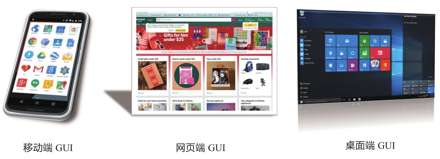 GUI智能体需要覆盖的操作平台主要包括移动端(Mobile)、网页端(Web)和桌面端(Computer),三者在交互模式、界面结构、操作细节上存在显著差异。平台差异不仅影响感知难度,也直接决定动作执行策略与推理路径。图4-2展示了各平台典型界面形态。表4-1总结了不同平台下GUI智能体面临的主要挑战、动作空间与典型任务。